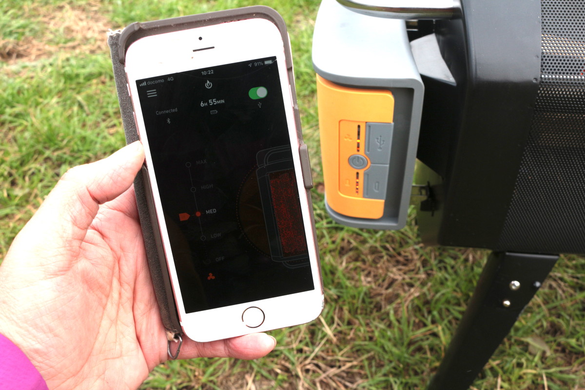 風量調整は、専用アプリでも行えます。スマホとBluetoothで接続してちょっぴり離れた場所でも風量をコントロールできるんです。焚き火をしたまま無人になることはありませんが、一度チェアに座ったら立ち上がるのは面倒。座ったまま、立ち上がることも、手を伸ばすこともなく焚き火をコントロールできるんですね。ひとりで撮影しているときなんかは、カメラを構えたまま風を送って炎の勢いをコントロールできることにも感動しました。