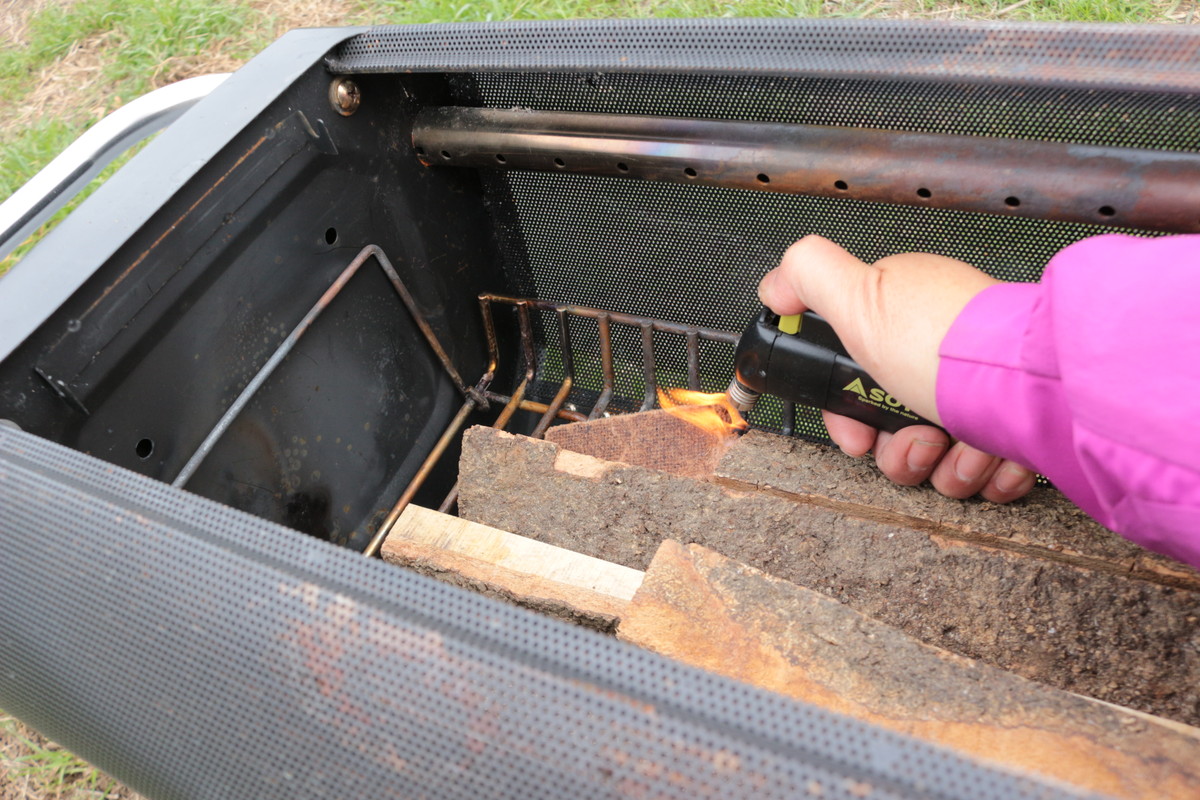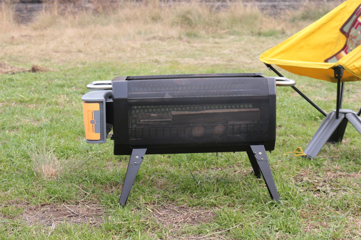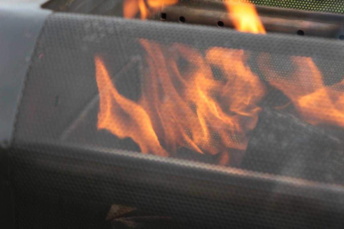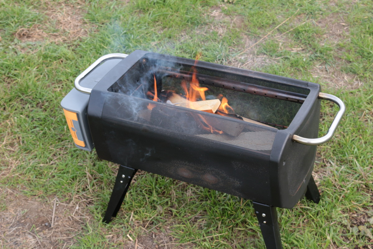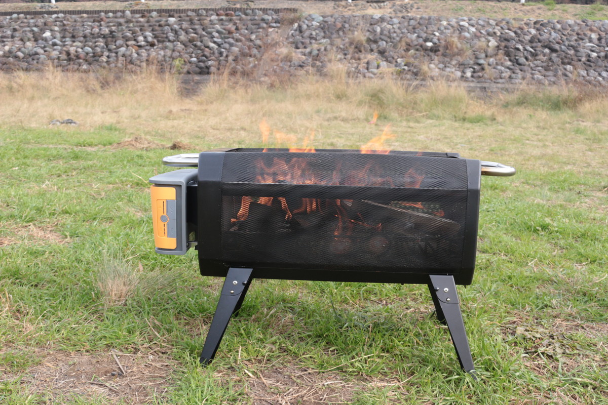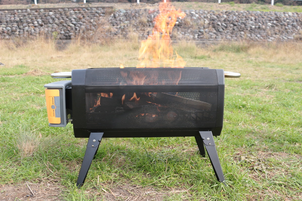 また、「ファイアピット」はバッテリーパックの装着されていない3方向から炎の様子がよく見えます。夜見ると、まるで焚き火が宙に浮いているかのようです。深いボックス状の燃焼室ですが、ファンとメッシュのおかげで薪の組み方に四苦八苦するなんて過去のこと。
