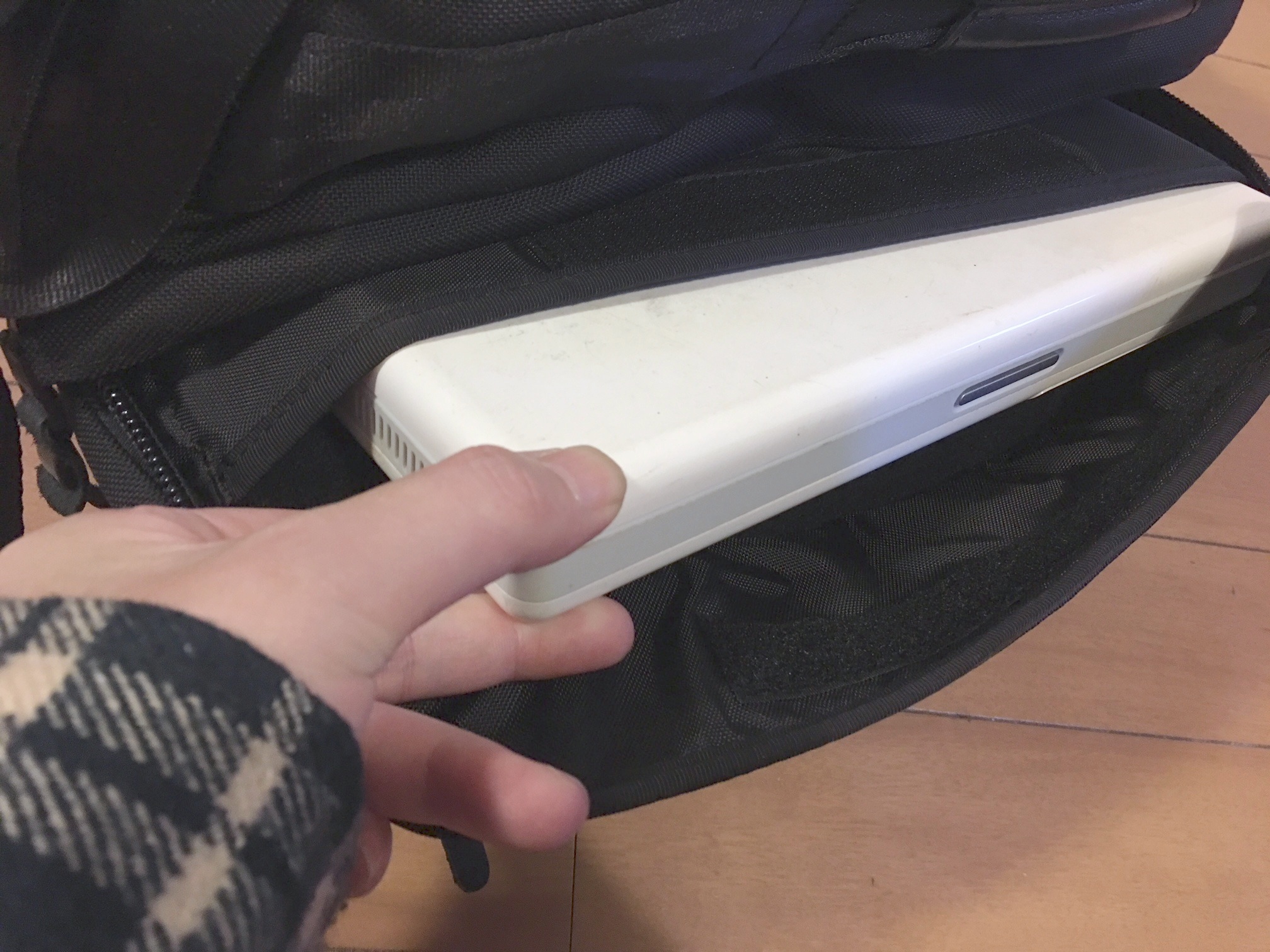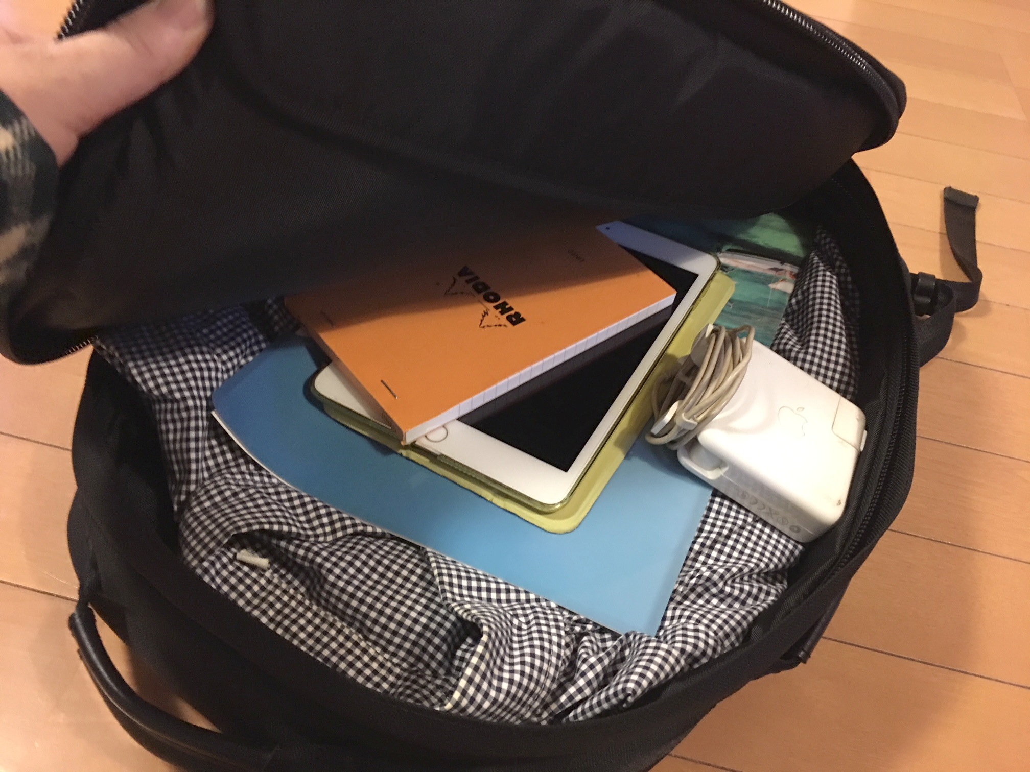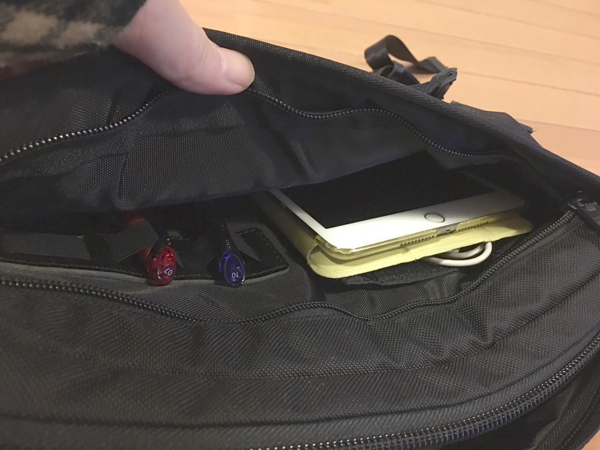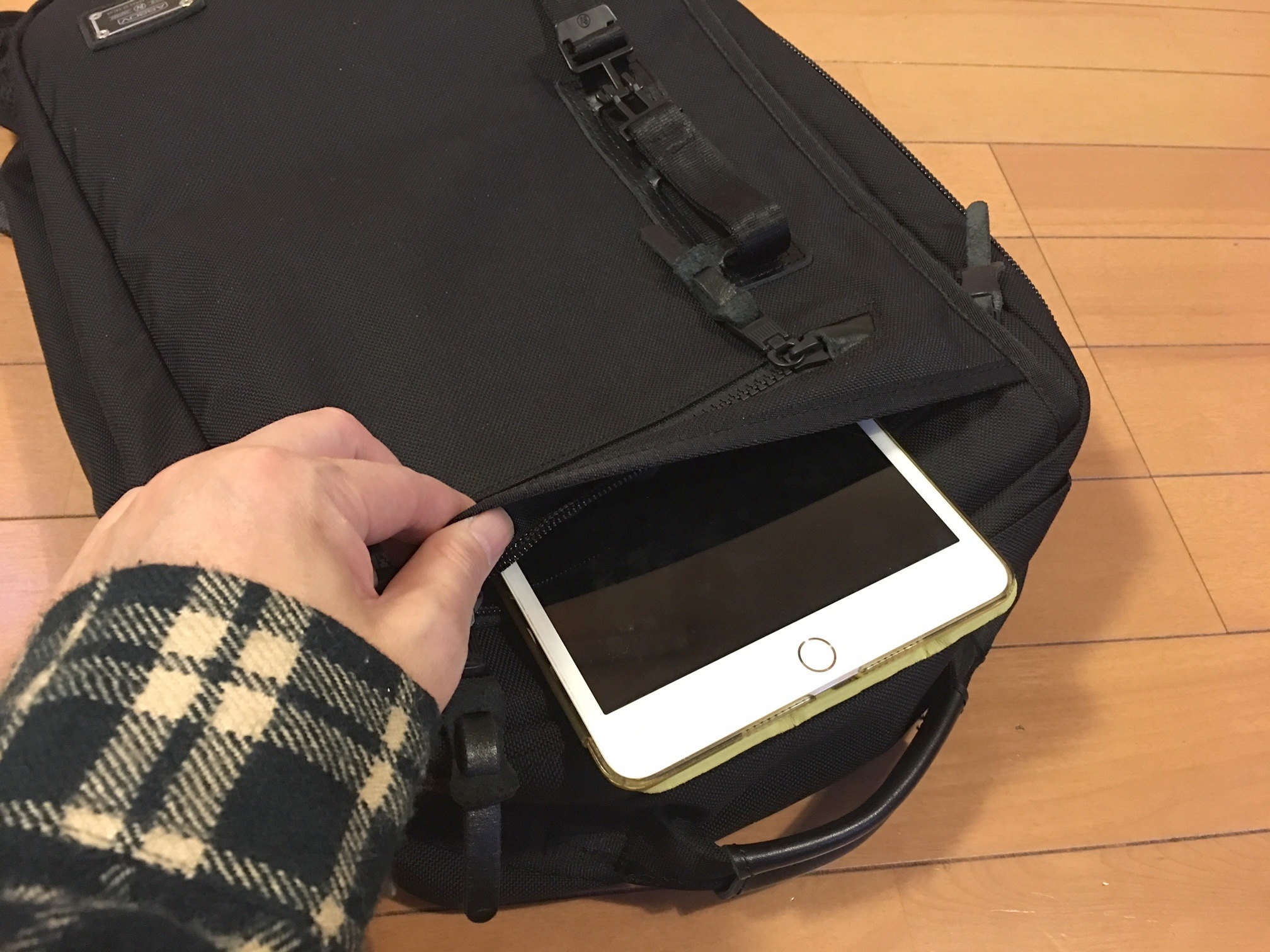 フロントポケットの奥側は若干大きめで、iPadミニサイズのタブレットなら余裕で収納できます。