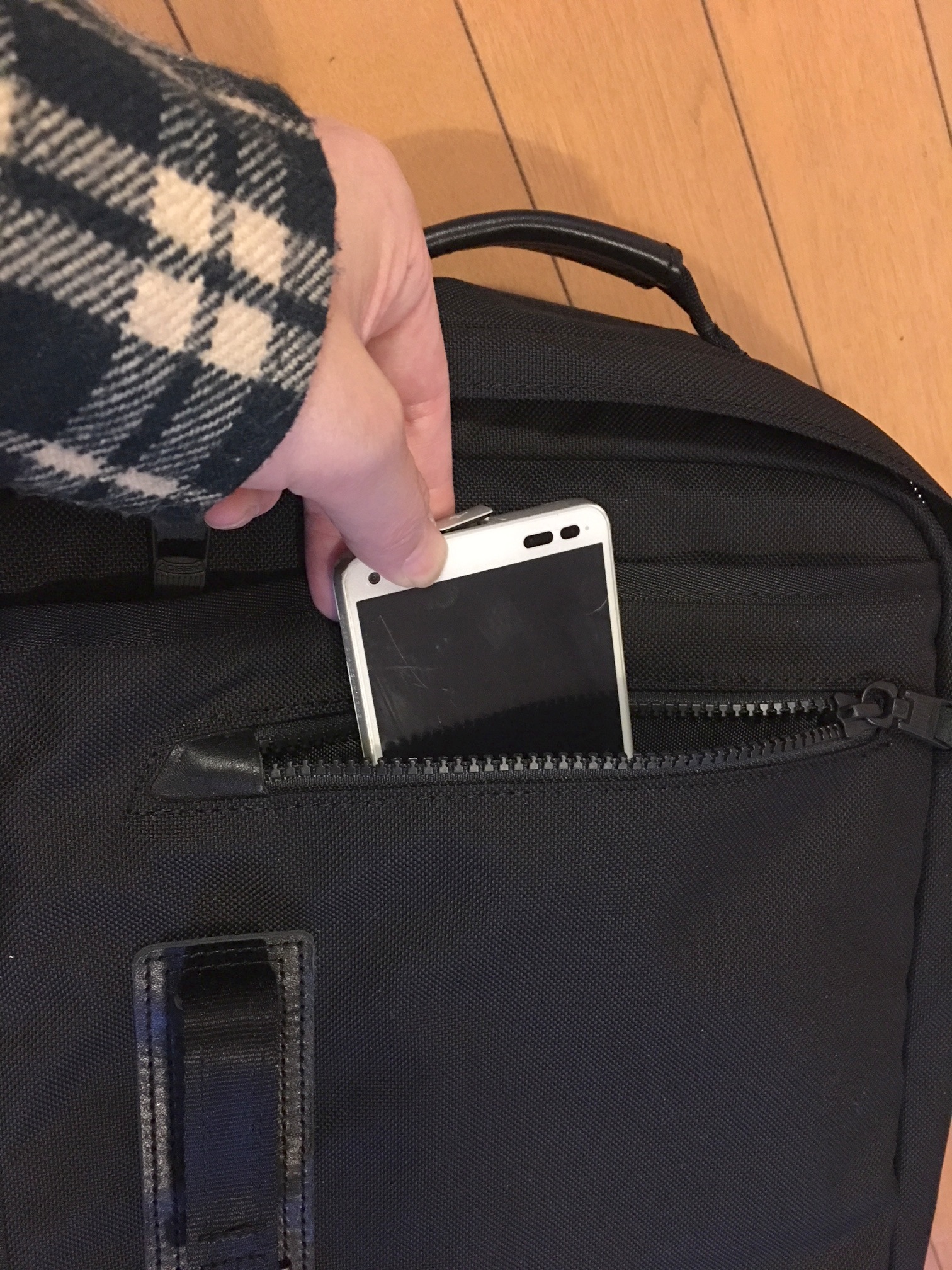 フロントにはポケットが2つあり、手前はスマホの収納に丁度良いサイズ感。