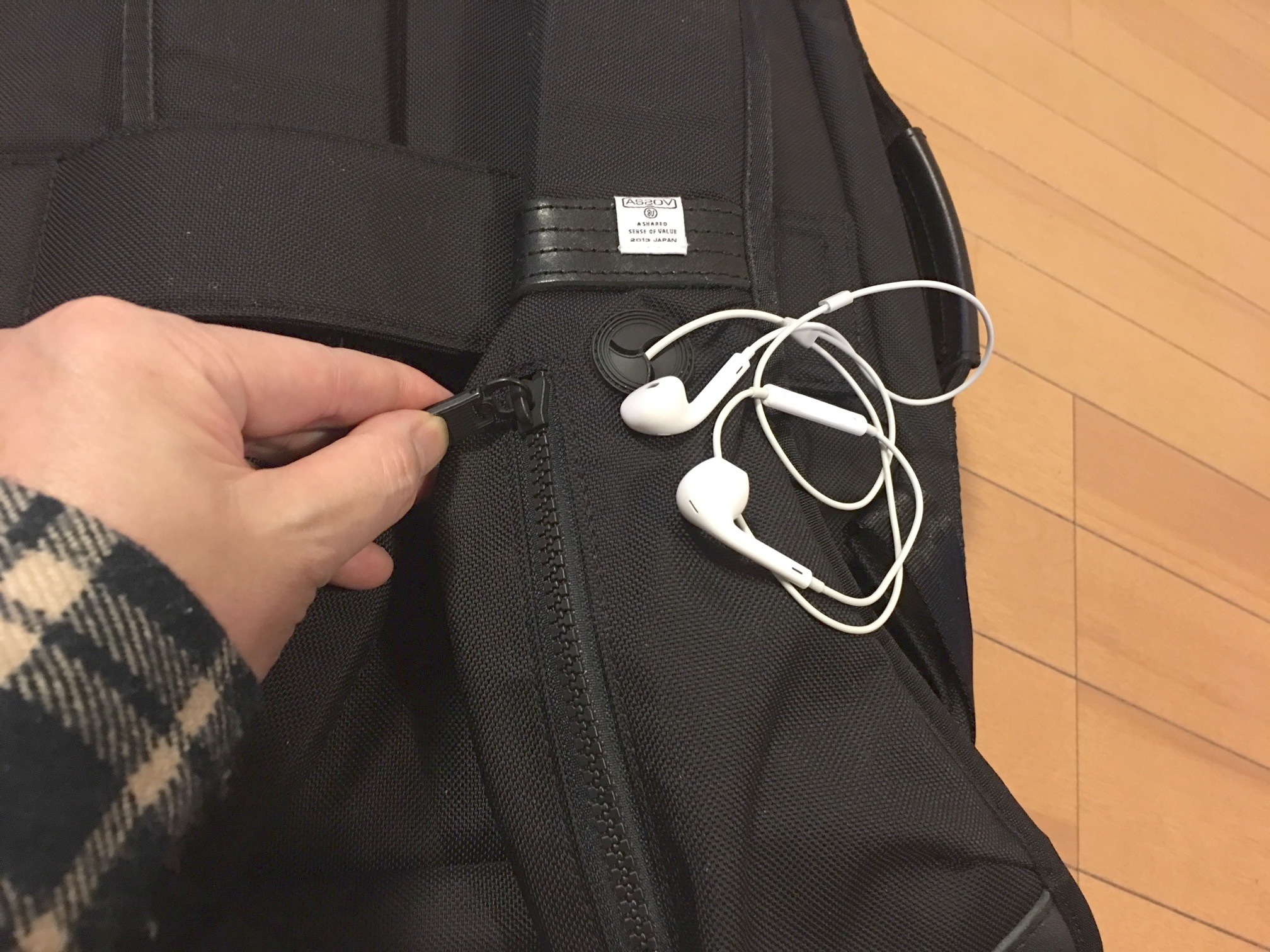 左側のショルダーストラップにはコードホール付きのファスナーポケットがあり、音楽プレーヤーの収納に最適です。