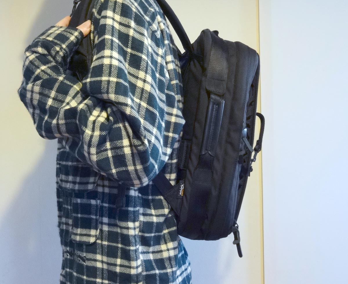 そして本作のポイントはココ! マチがたったの12cm! 高機能バックパックでここまでの薄型はあまり見掛けません。これなら人混みの中でもササッと動き回れちゃいますね!