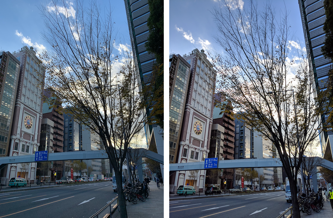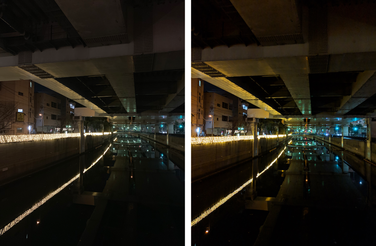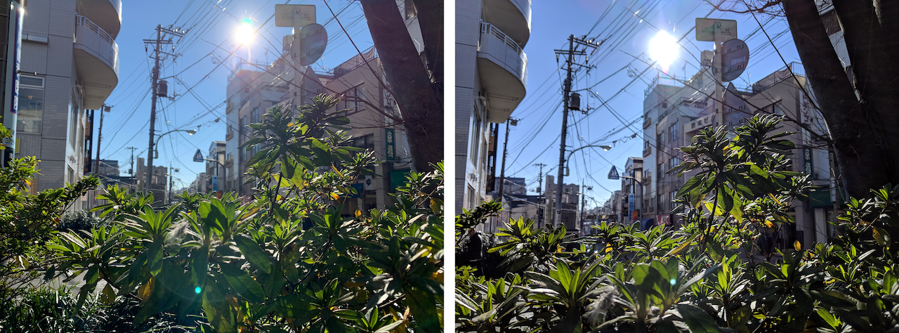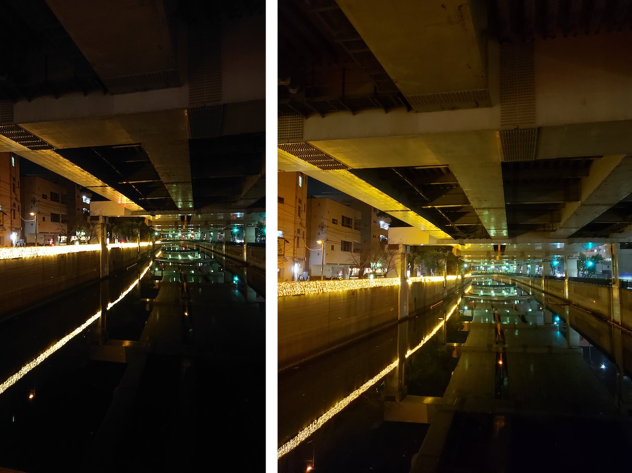 ▲iPhone XS(左)、Pixel 3(右 ※夜景モードは非使用)