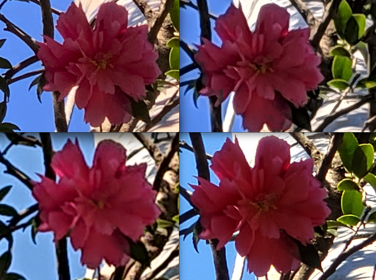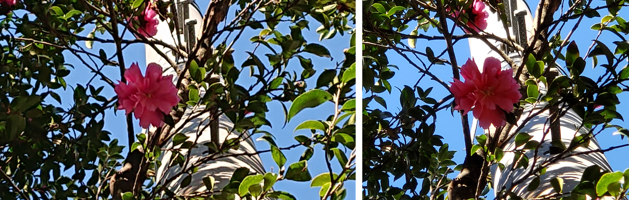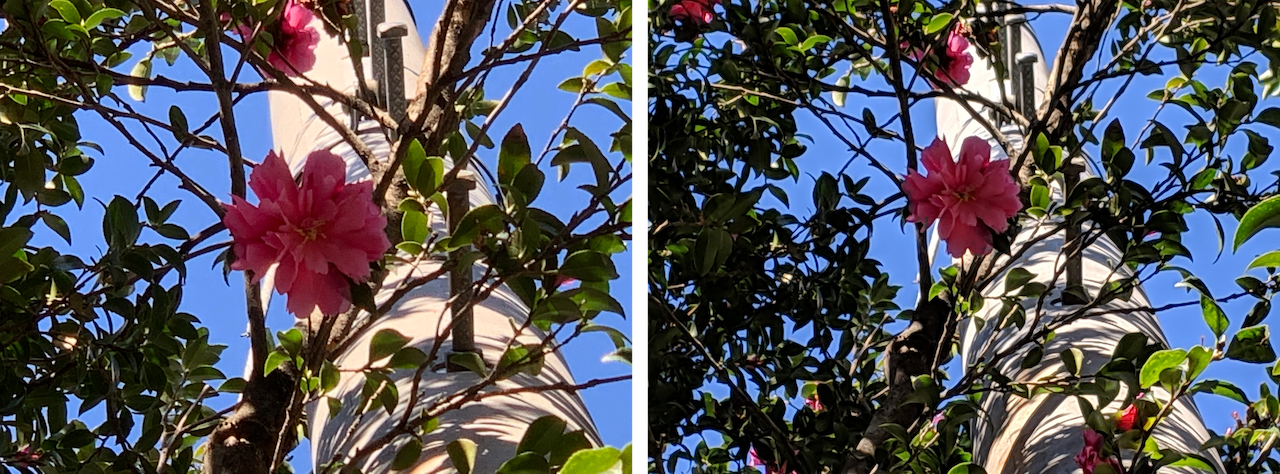 Xperia XZ3では、花の中央部分でディティールが潰れているのに対し、同じシングルカメラであるPixel 3では、辛うじてその輪郭が残っています。おそらく、Googleが「超解像ズーム」と称している機能の恩恵でしょう。