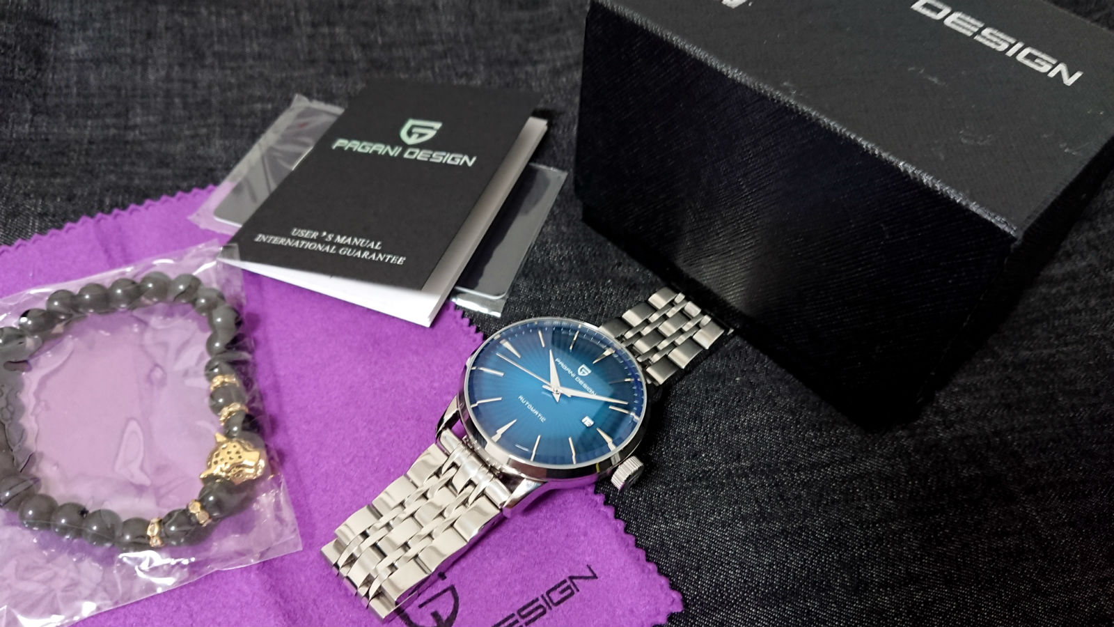 「PAGANI DESIGN(パガーニ・デザイン)」というブランド名の腕時計で、ブランドロゴの入った化粧箱に取説、ギャランティカード、マイクロファイバークロスの他に…何故か数珠が同梱されていました…(笑)。豹頭の飾りが入った物なのですが、縁起物とかなのでしょうか…。イマイチ意図がわからず困惑するばかり。