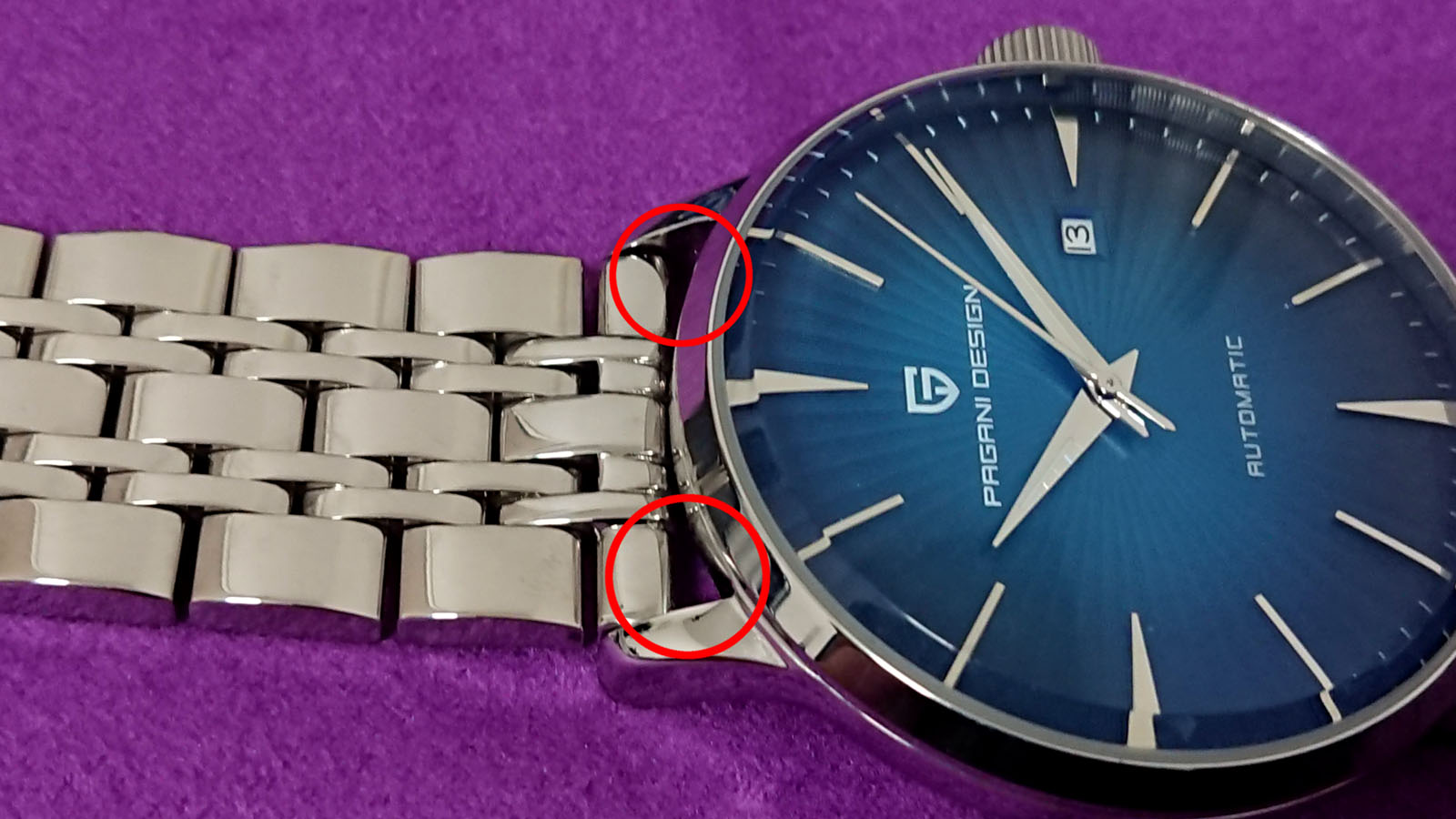 メタルブレスレットには大きく分けて弓環タイプと直管タイプの2種類があり、接合部分の本体ケース側が曲線なのに直管タイプが付くと、コチラの画像の赤丸部分のように隙間ができてしまうんですよね。個人的にはこの隙間のスカスカ感があまり好きではないのですよ。
