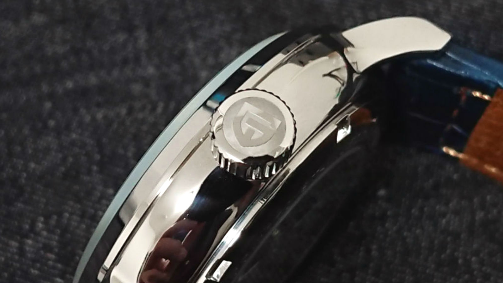 リューズにも浅くですがブランドロゴが彫り込まれていて、こういった細部もなかなか凝った作り。