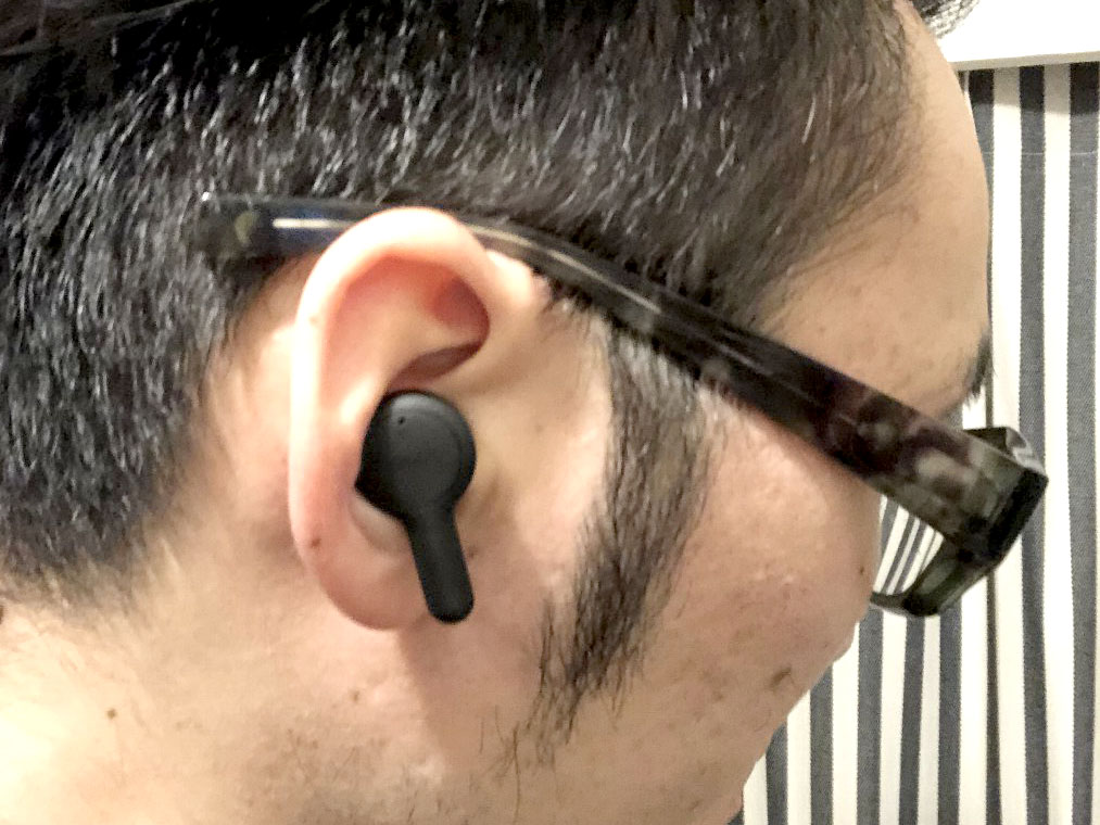 外見は、アップルの「AirPods」を彷彿とさせるデザイン。これは“シグネチャーステムデザイン”と言います。装着すると耳から大きく下に垂れ下がるので、さすがにコンパクトではありませんが、飛び出たチューブ部の先端にはハンズフリー通話用のマイクを付けた通話性を考慮したデザイン。イヤホン左右をワイヤレス接続するBluetoothアンテナもここに内蔵しています。