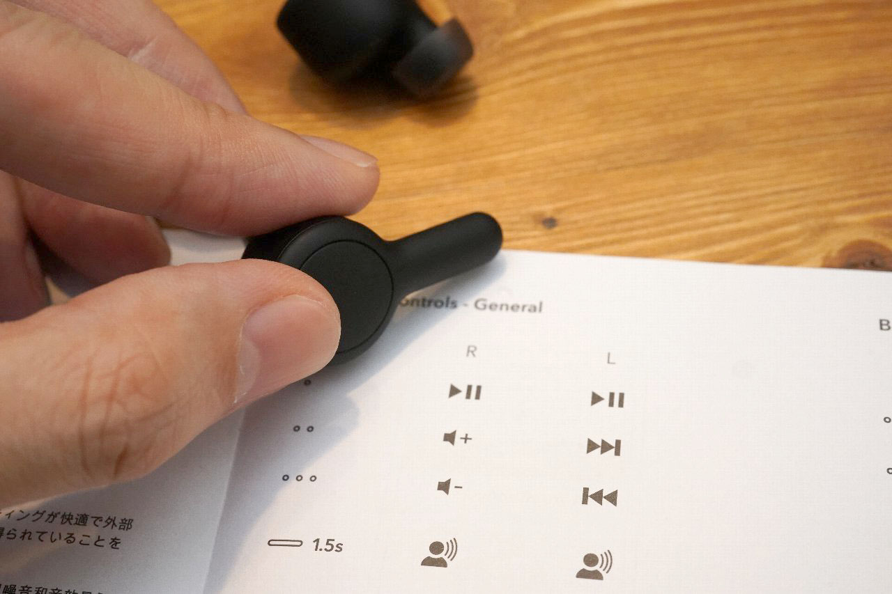イヤホン本体は両側ともボタンとなっていて、右が再生/停止や音量、左が曲送り/曲戻し、1.5秒の長押しでボイスアシスタントにも対応と一通りの操作に対応します。音量操作もイヤホンのみで操作できるのは優秀ですね。
