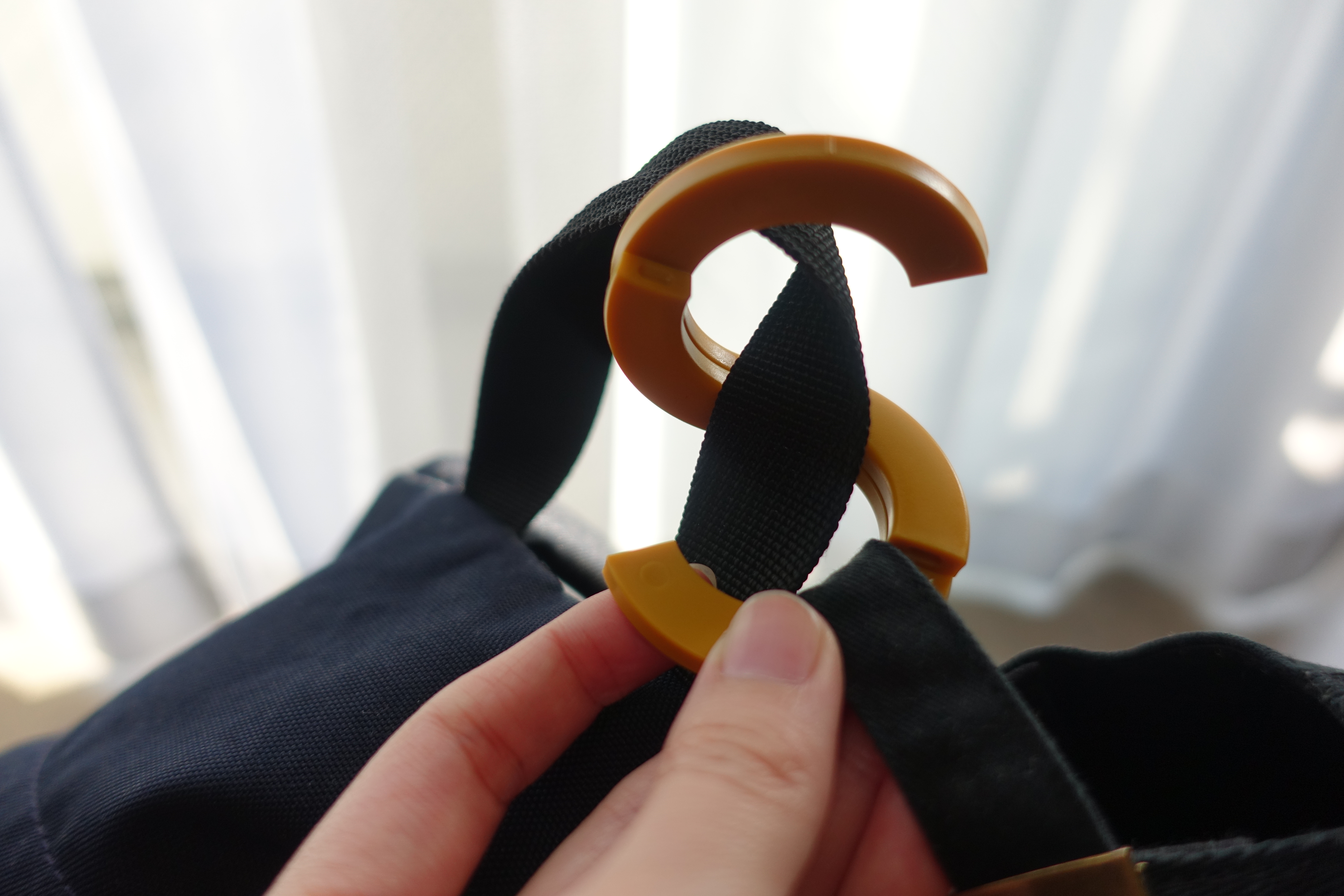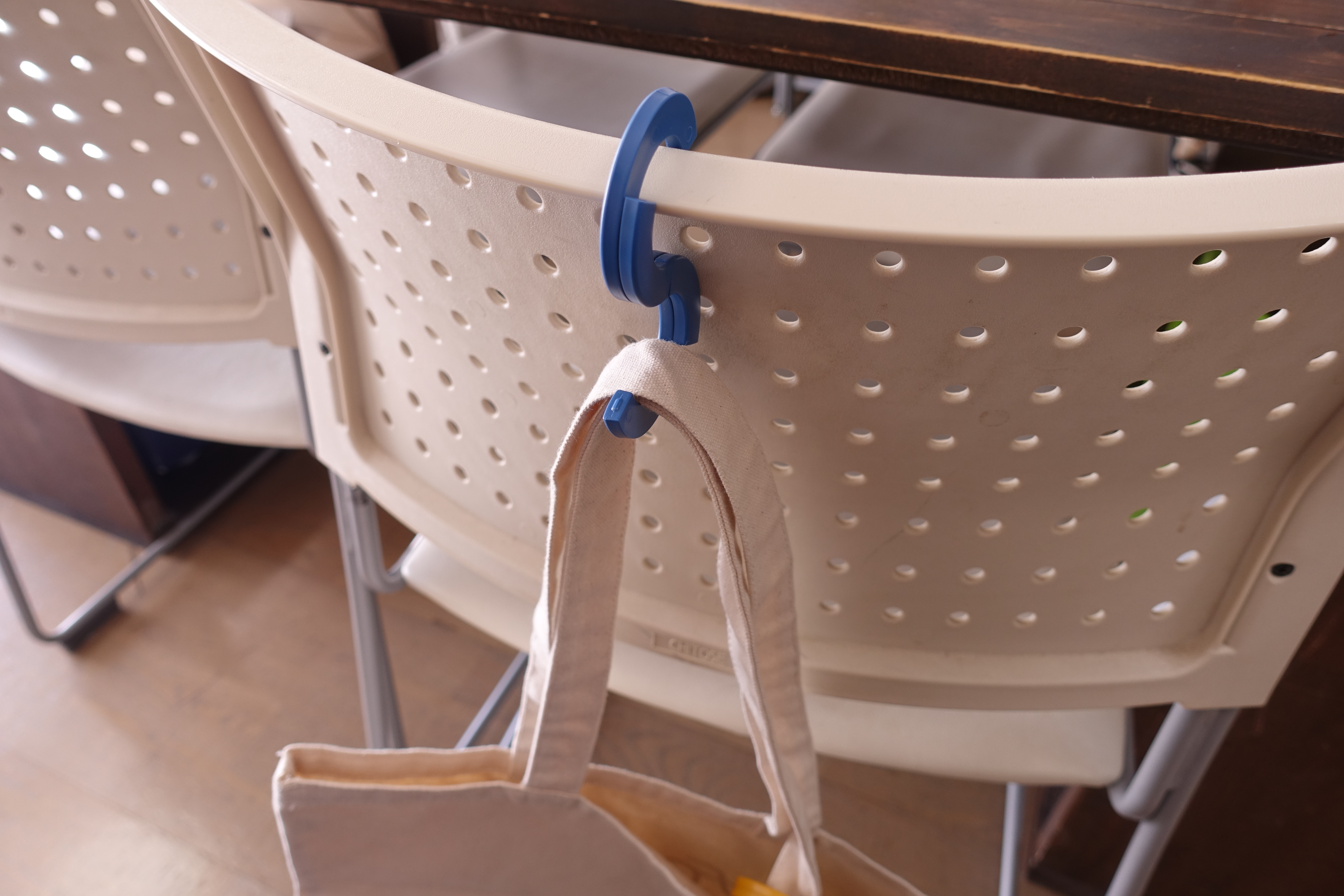 また、出先でイスに引っ掛けて使うことも可能。ただし、厚みのあるイスの場合は、S字フックのサイズが小さく引っ掛けられない場合もあります。