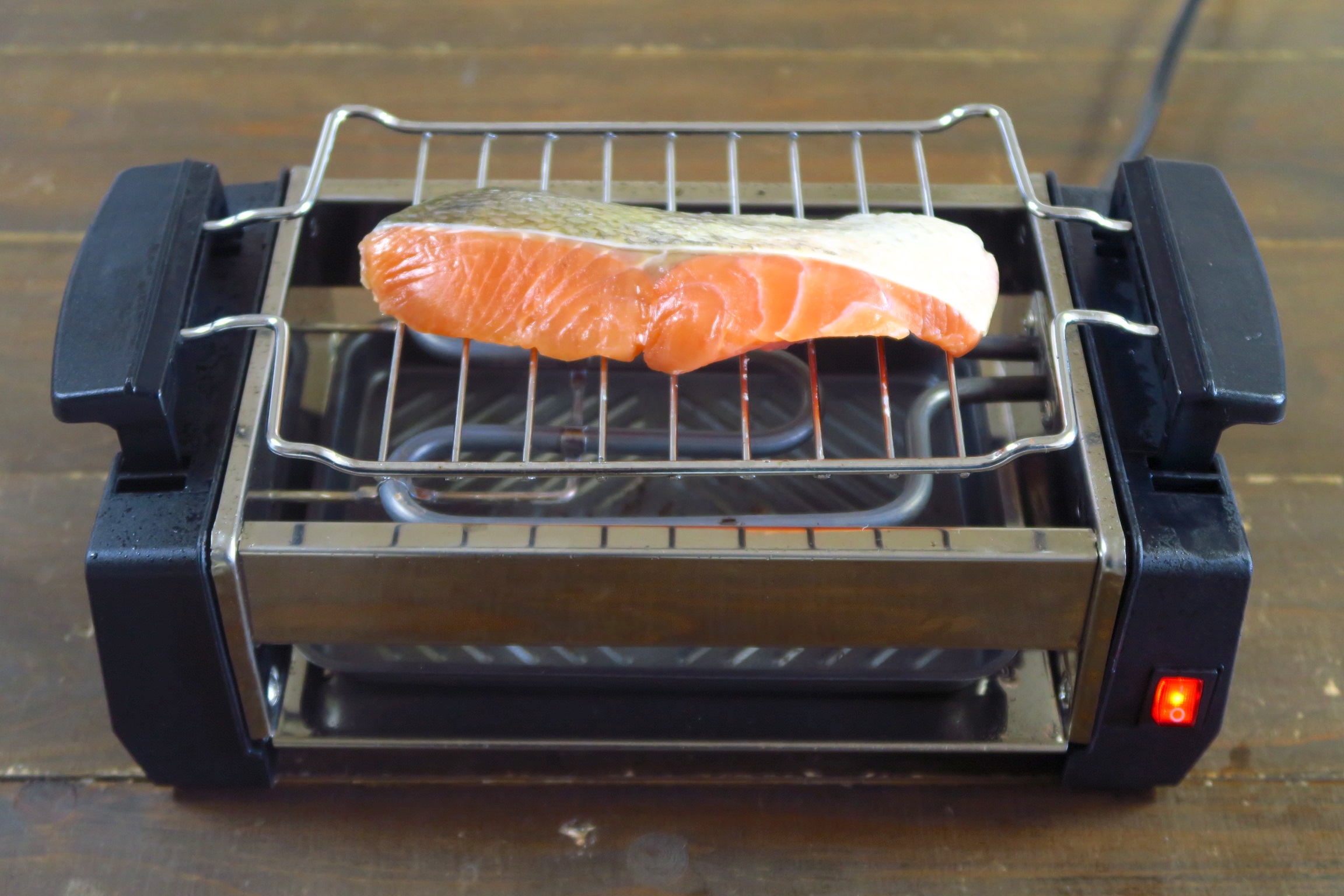 もうひとつ試してみたのは、魚焼きです。プレートを外して焼き網の上で鮭を焼いてみました。