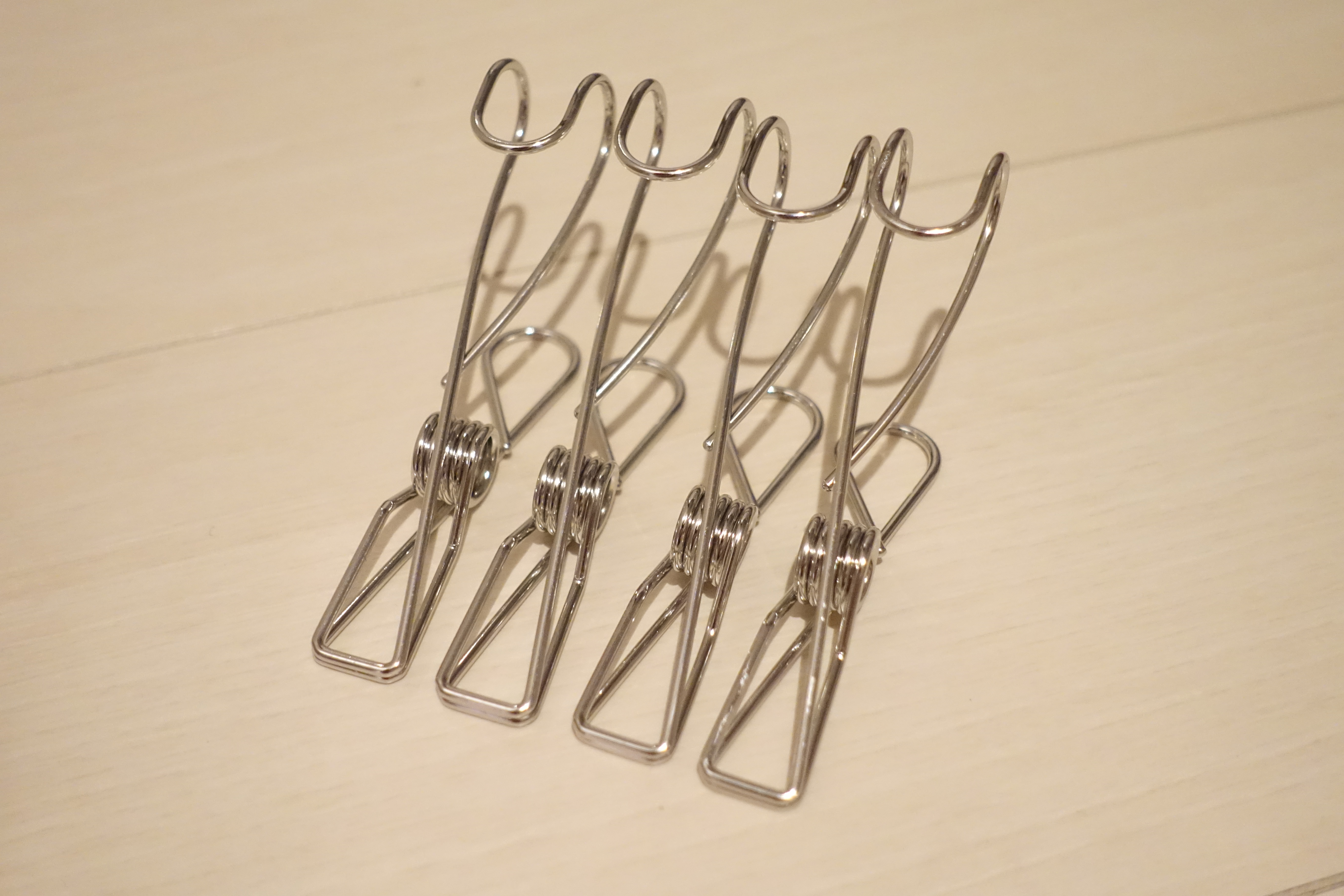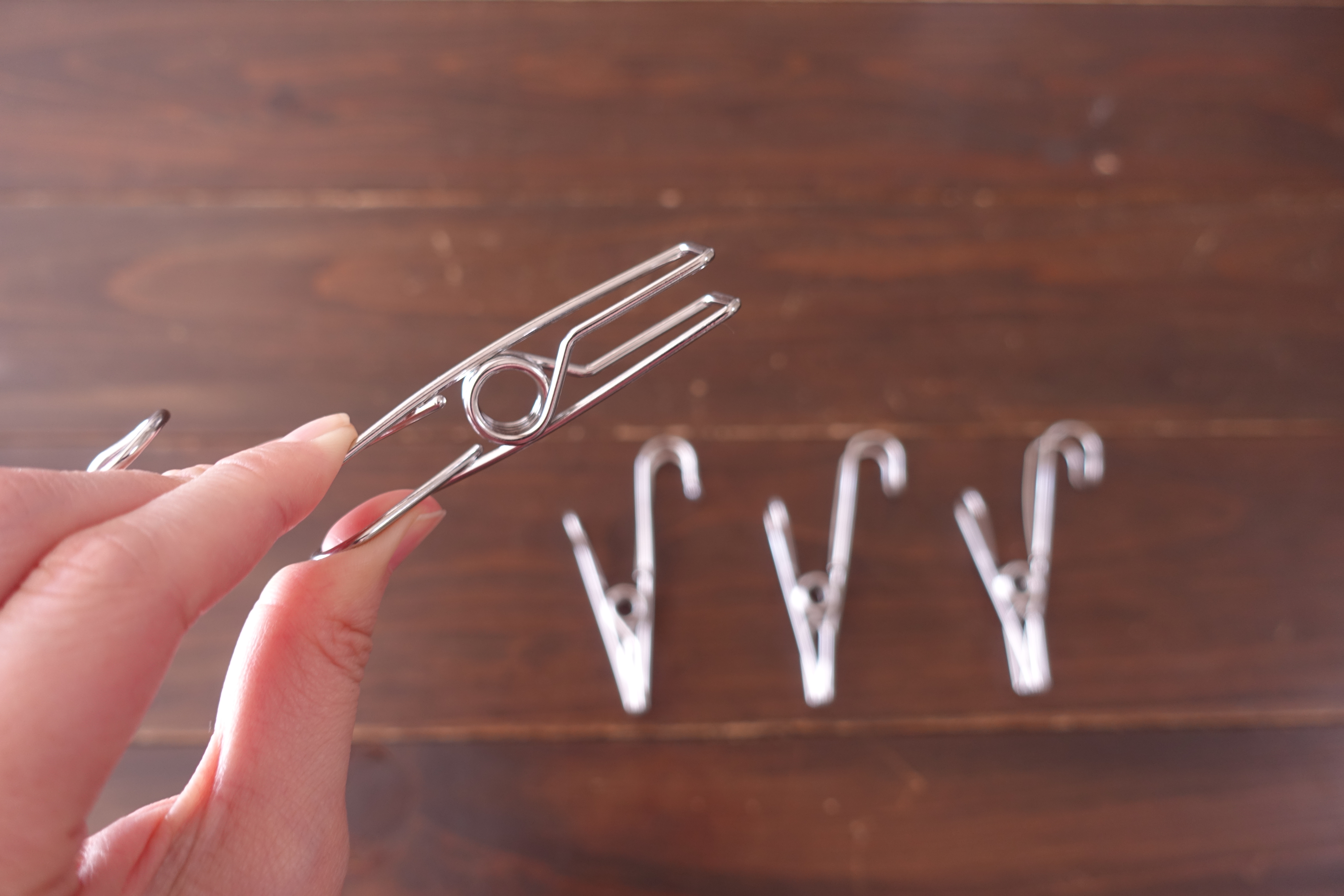 ひと袋4個入りの「ステンレスひっかけるワイヤークリップ」は、バーに引っ掛けて使用するクリップ。ものを挟んだままで収納できるのがメリットです。