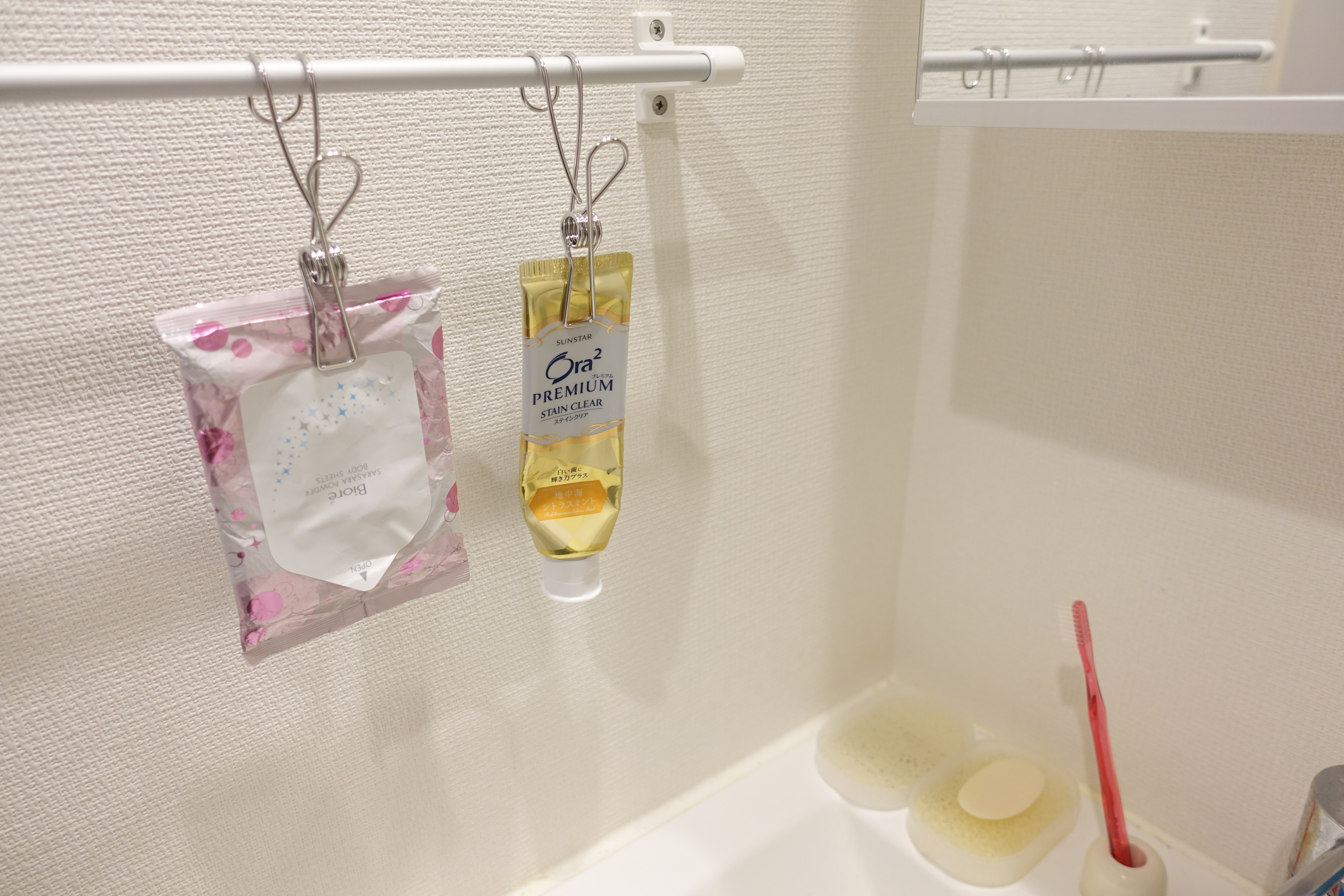 ▲洗面所のバーに、ウェットシートと歯磨き粉を吊るした。ウェットティッシュは引っかけたまま取り出しやすい
