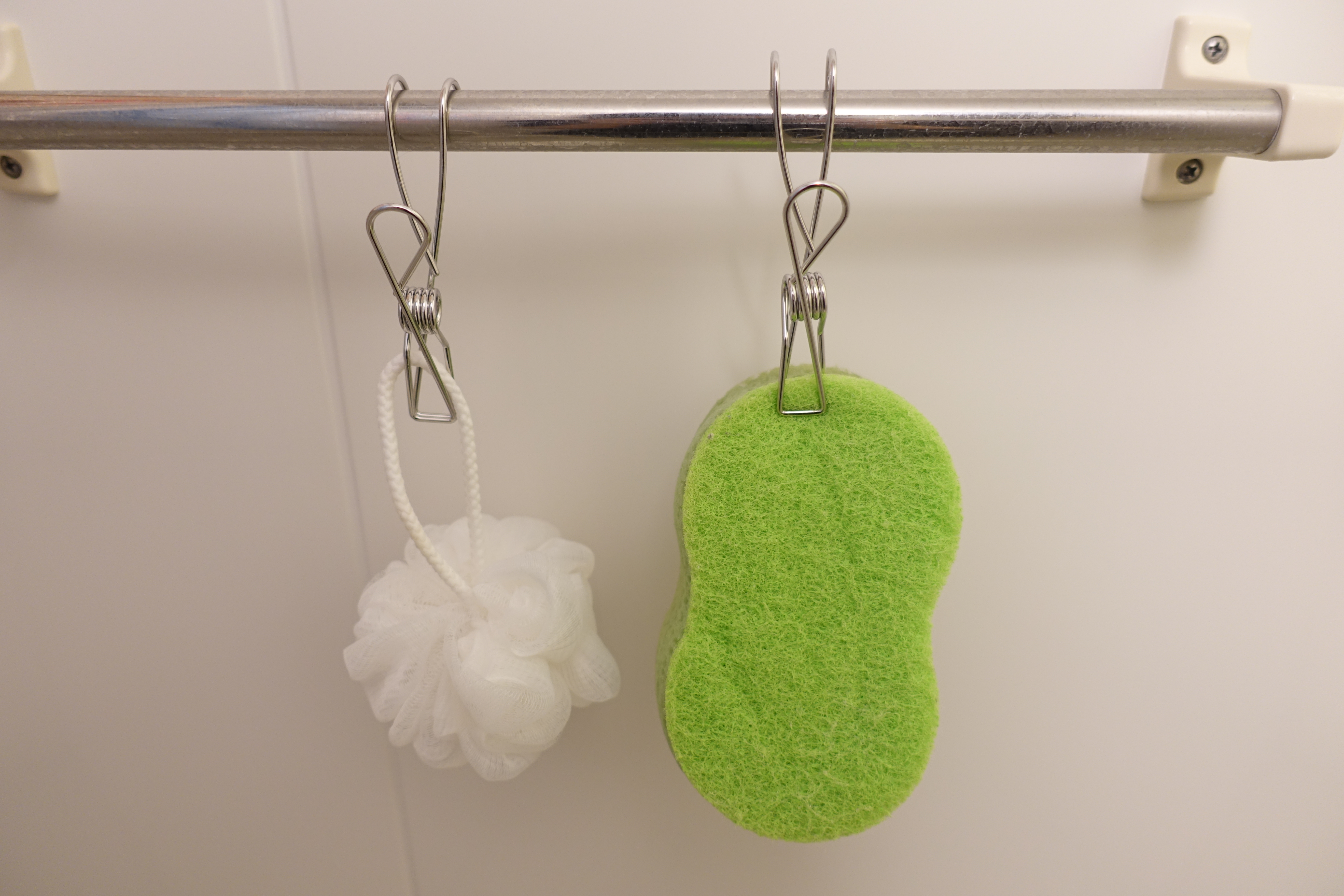 密閉された高温多湿の浴室でトレイなどに直接置いておくと、清潔面が気になる…という人もいますよね。そんな悩みは、ワイヤークリップに吊るして解決です。まとめて掃除用に使うスポンジも干しちゃいましょう。もちろん、ボディタオルを吊るせば、バーにかけるよりも接地面が減るので、より衛生的です。