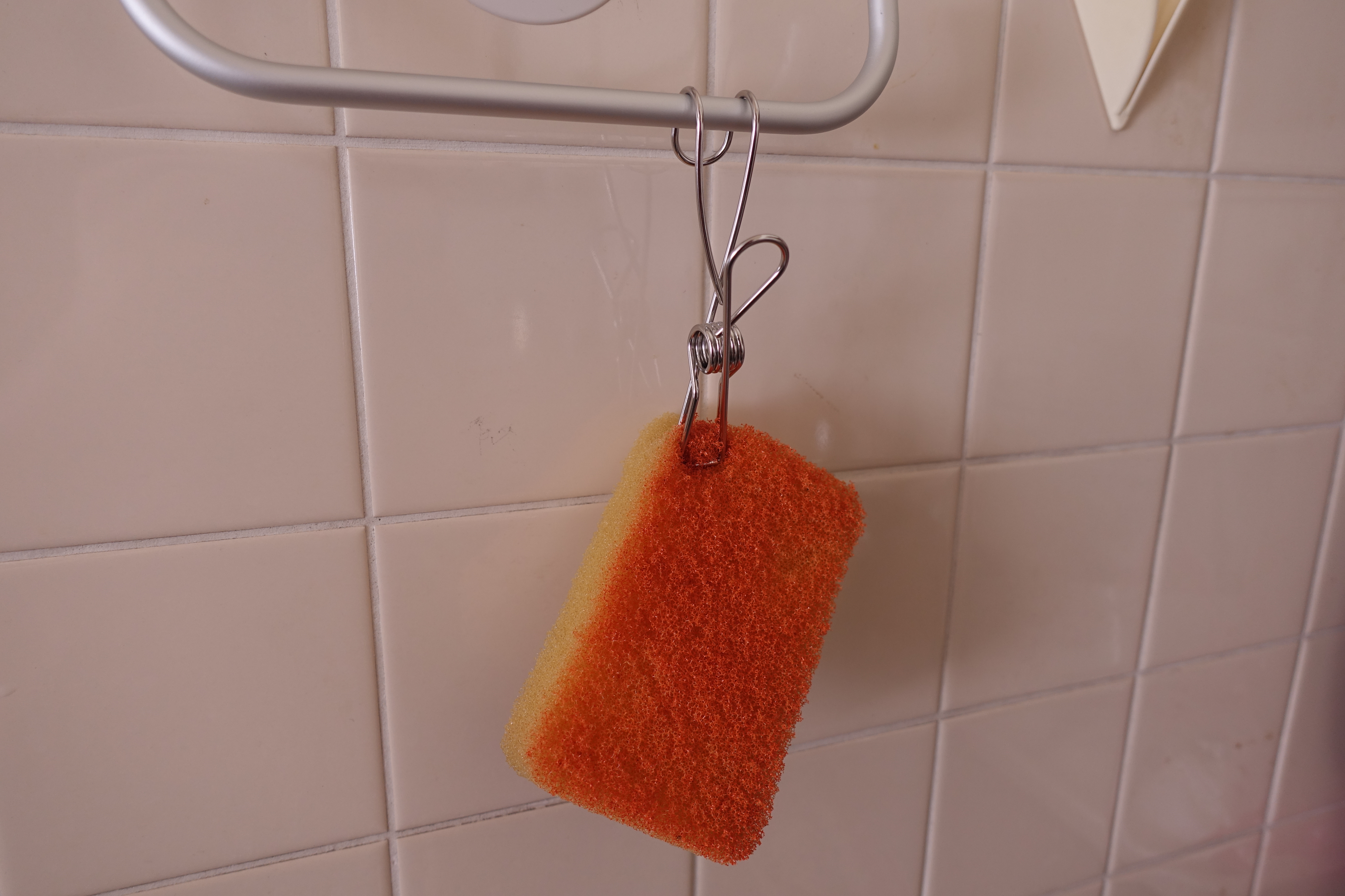 ▲濡れたスポンジも、吊るしておけばすぐに乾く