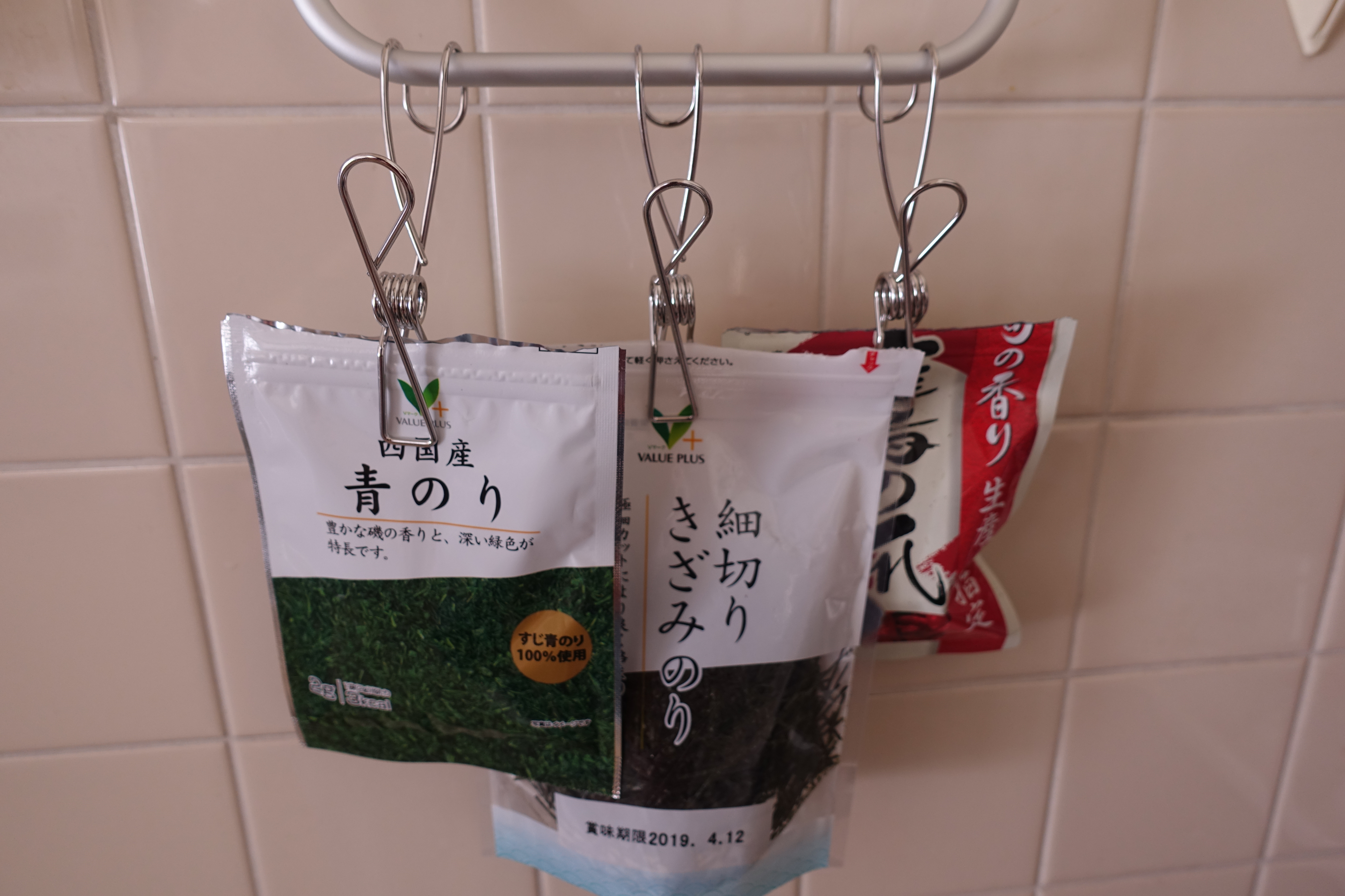 料理中は、調理機器や食材で調理スペースが煩雑になるのが悩ましいところ。そこで、ワイヤークリップを使えば、“調味料置き場“として活用できます。青のりやきざみのりなど、粉ものの調味料袋を吊り下げておけば、サッと取れて便利。