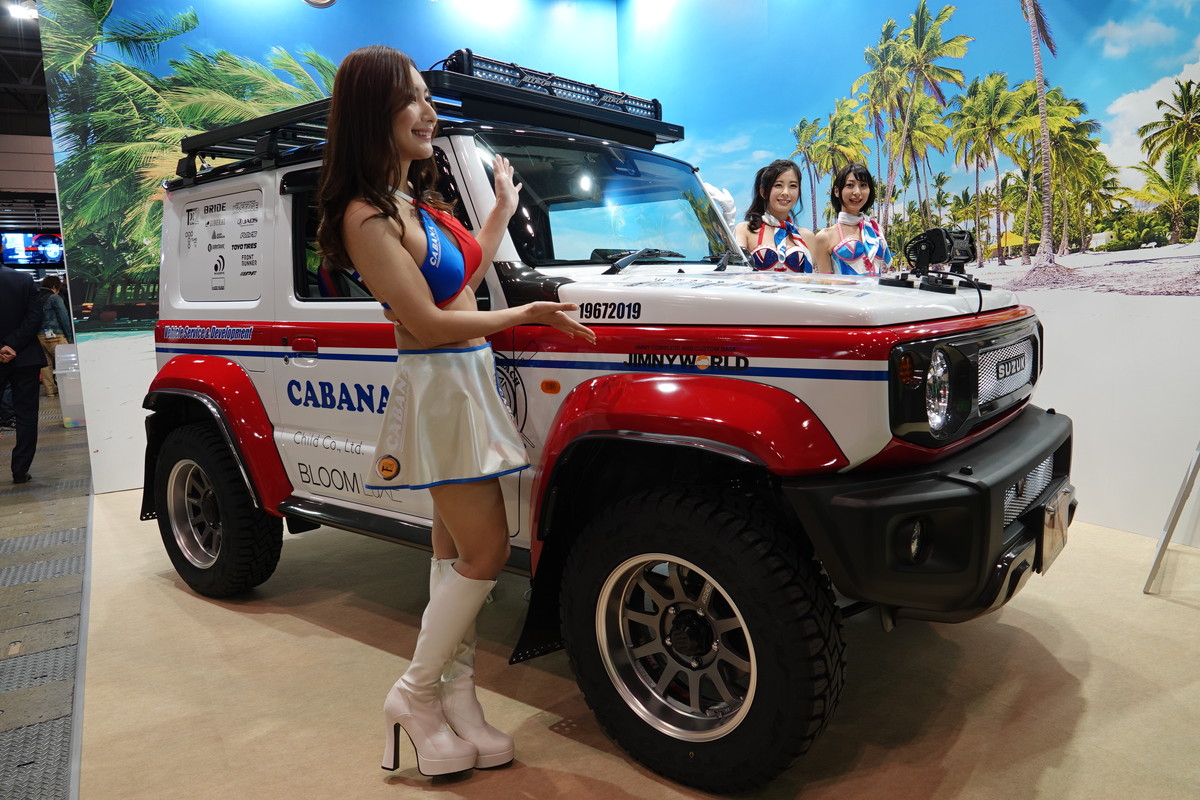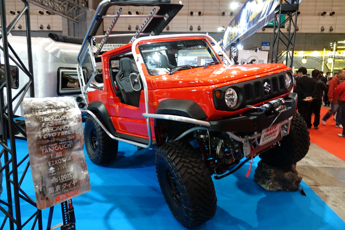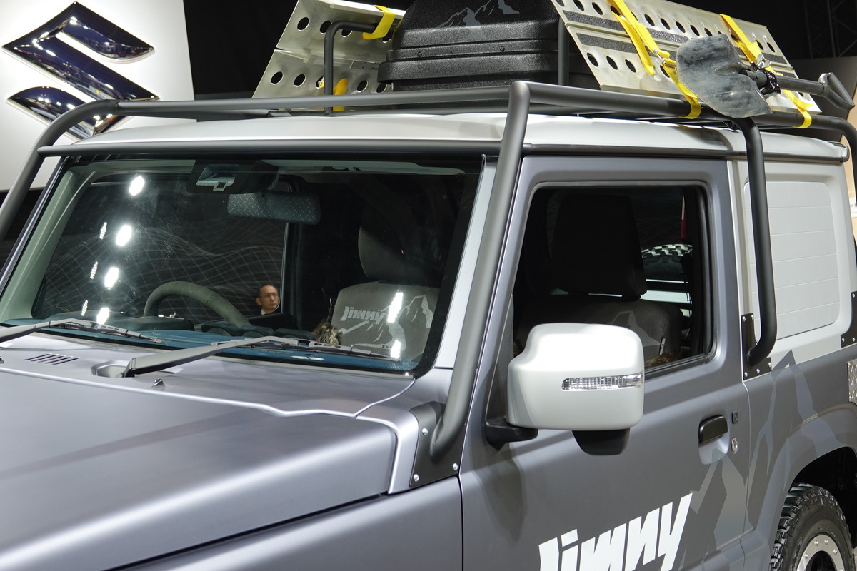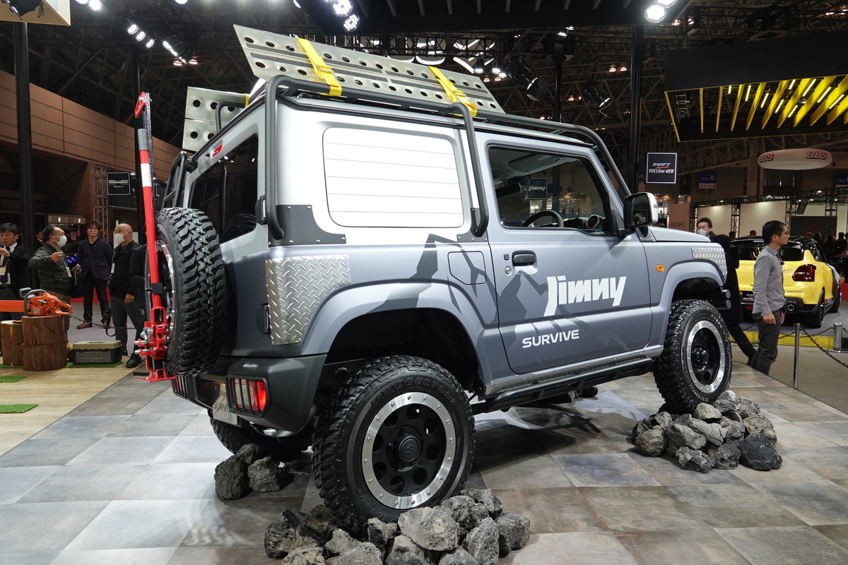 新型ジムニー生みの親であるスズキが、ジムニーとジムニーシエラのコンセプトモデルを出展。参考出品となるジムニーのカスタムモデルは「ジムニーサバイブ」。