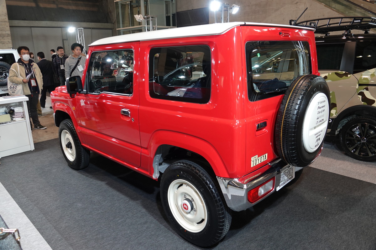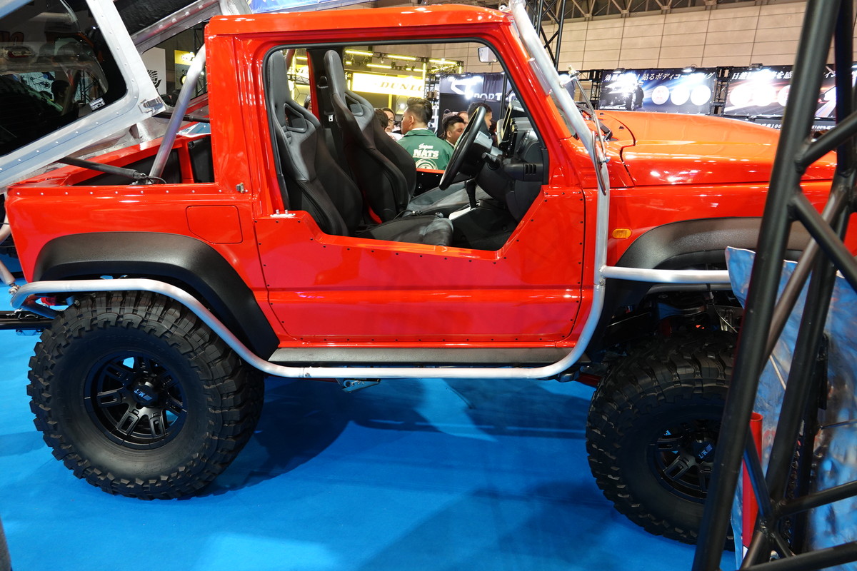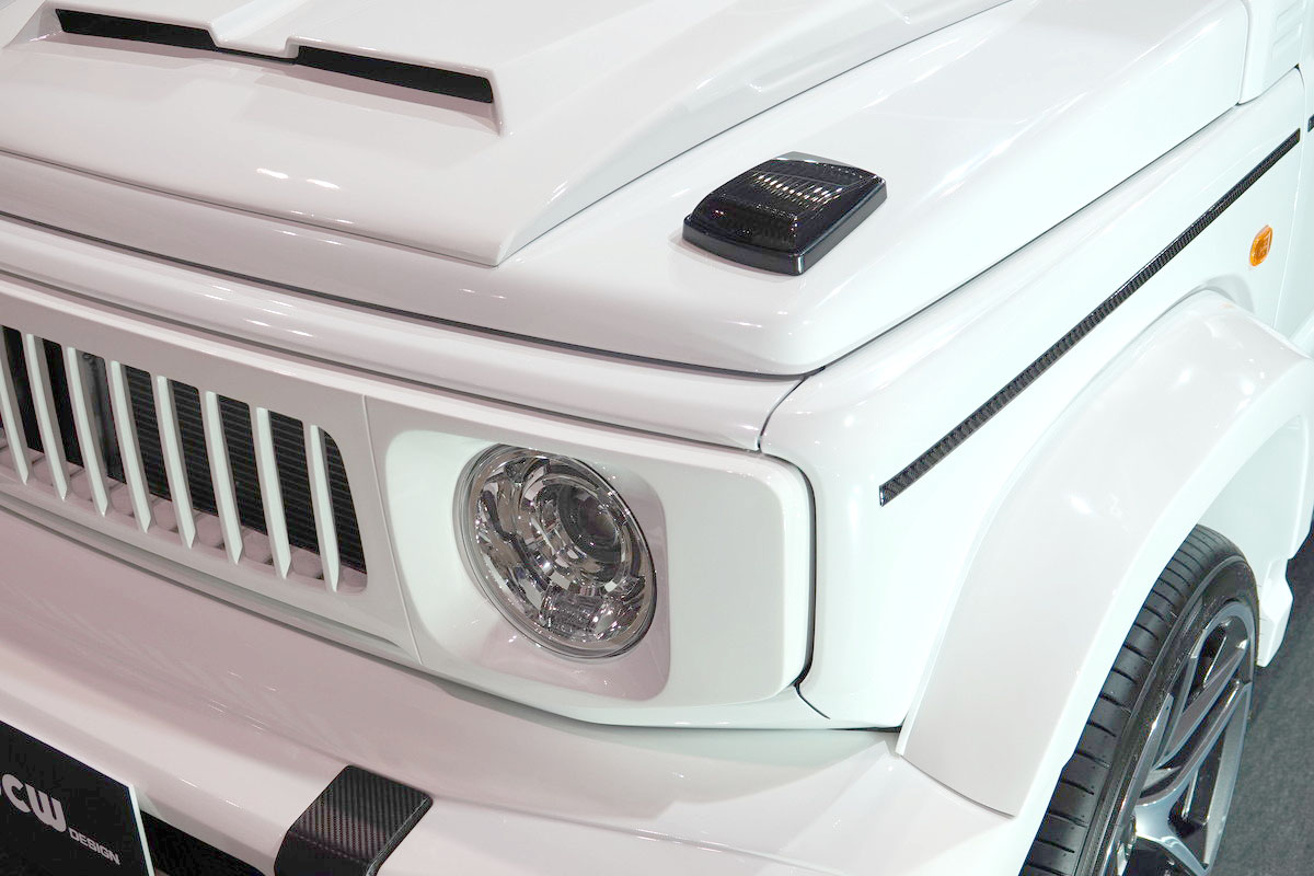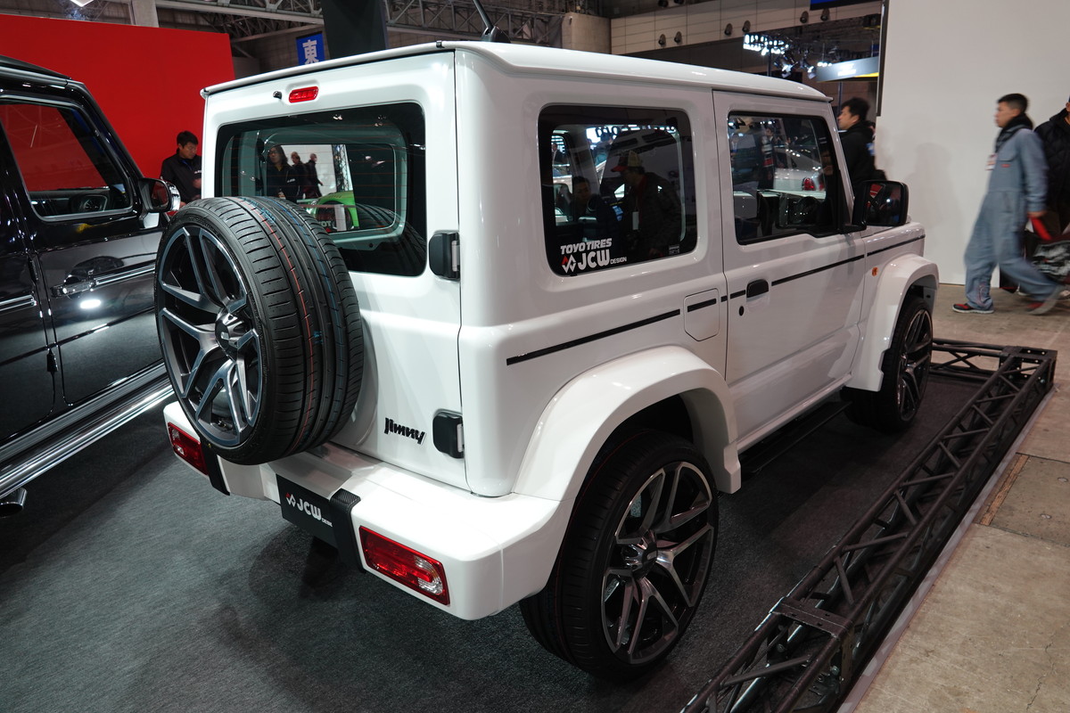 大阪にあるカスタムショップ「PRO-STAFF」は、自身のブランドであるJCW DESIGNからジムニーを出品。その名も「mini G63」。会場では、AMG G63のカスタムカーと一緒にジムニーを展示していました。