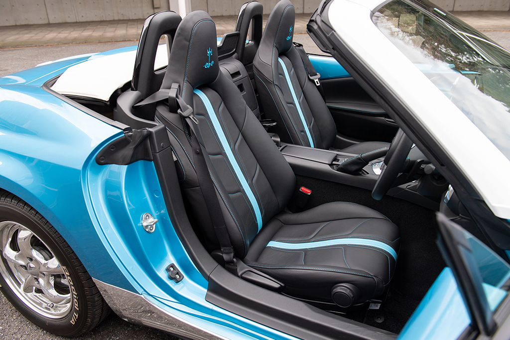 ロックスターのボディサイズは、ロードスターと比べて全長が430mm長く、全幅も35mm拡大されています。ロックスターのボディパネルはFRPで成形されていて、ドアの開口部や給油口のフタなどをよく見ると、つなぎ目がなんとなく分かるのですが、普通に眺めていると見逃してしまいそう。それだけ完成度が高いといえます。また、ソフトトップもロードスターのものがベースなので、手動で軽々と開閉でき、使い勝手にも優れています。