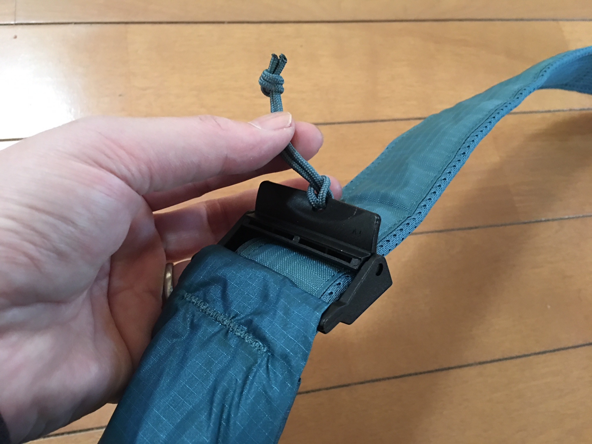 ショルダーベルトはバックル式で長さの調節がワンタッチ。ストラップが付いているのでグローブしながらでもラクチンです。