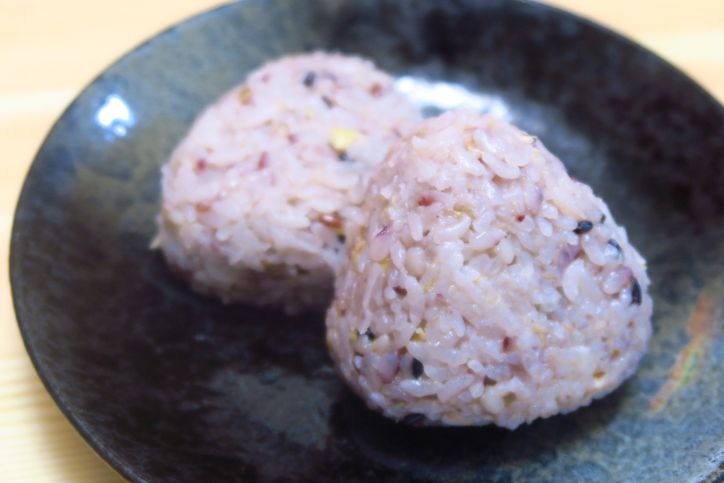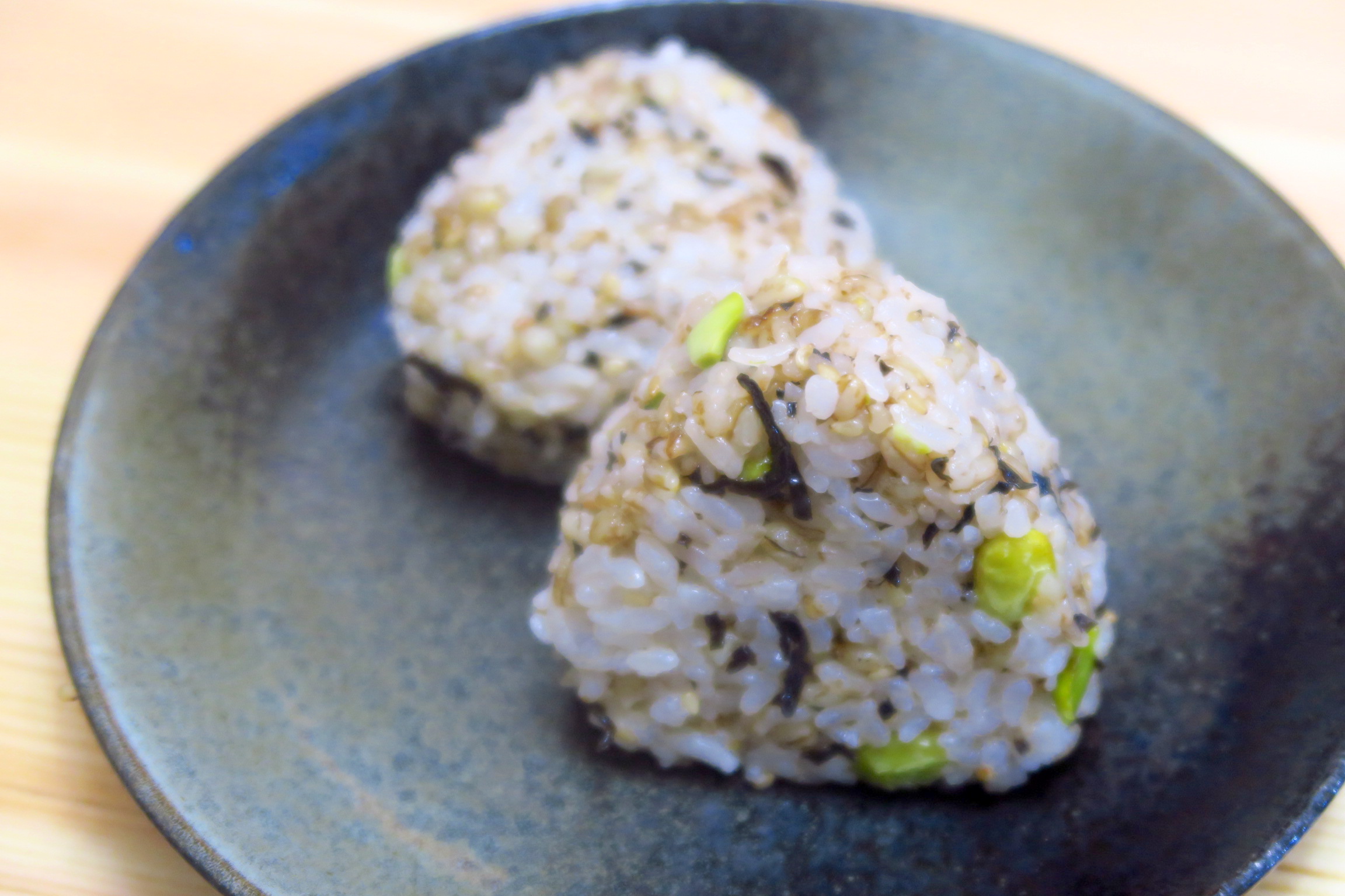 ▲もち麦のぷちぷちした食感と枝豆の食感が楽しめる枝豆塩昆布おにぎり。塩昆布は程よい塩気があっていい