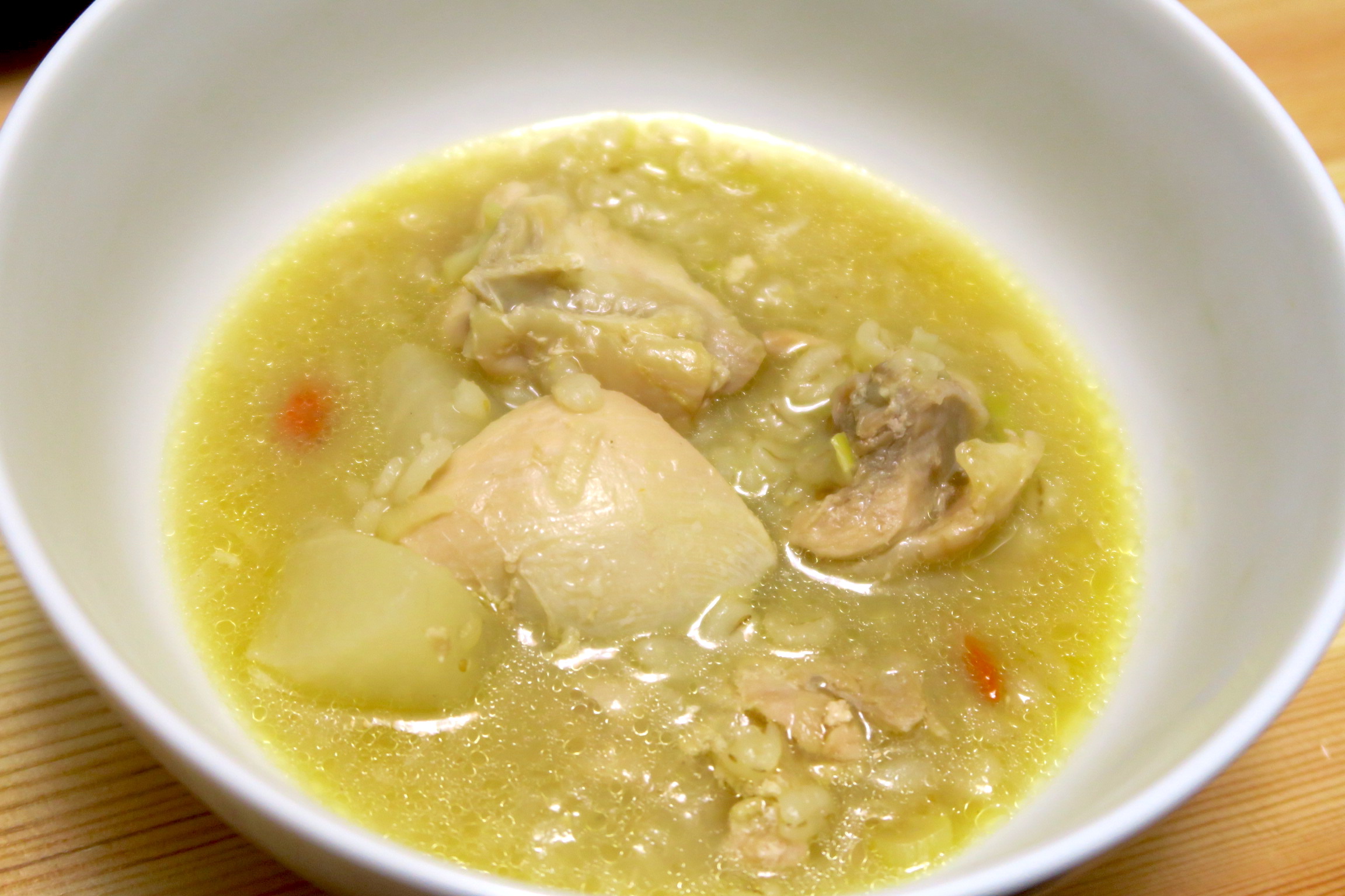 化学調味料を使っていないので、非常に優しい味わいのスープに仕上がっています。ほろほろの鶏肉だけでなく、大根や玉ねぎ、白ねぎ、押し麦などが入っていて、身体に良さそうな感じがするのもポイントです。