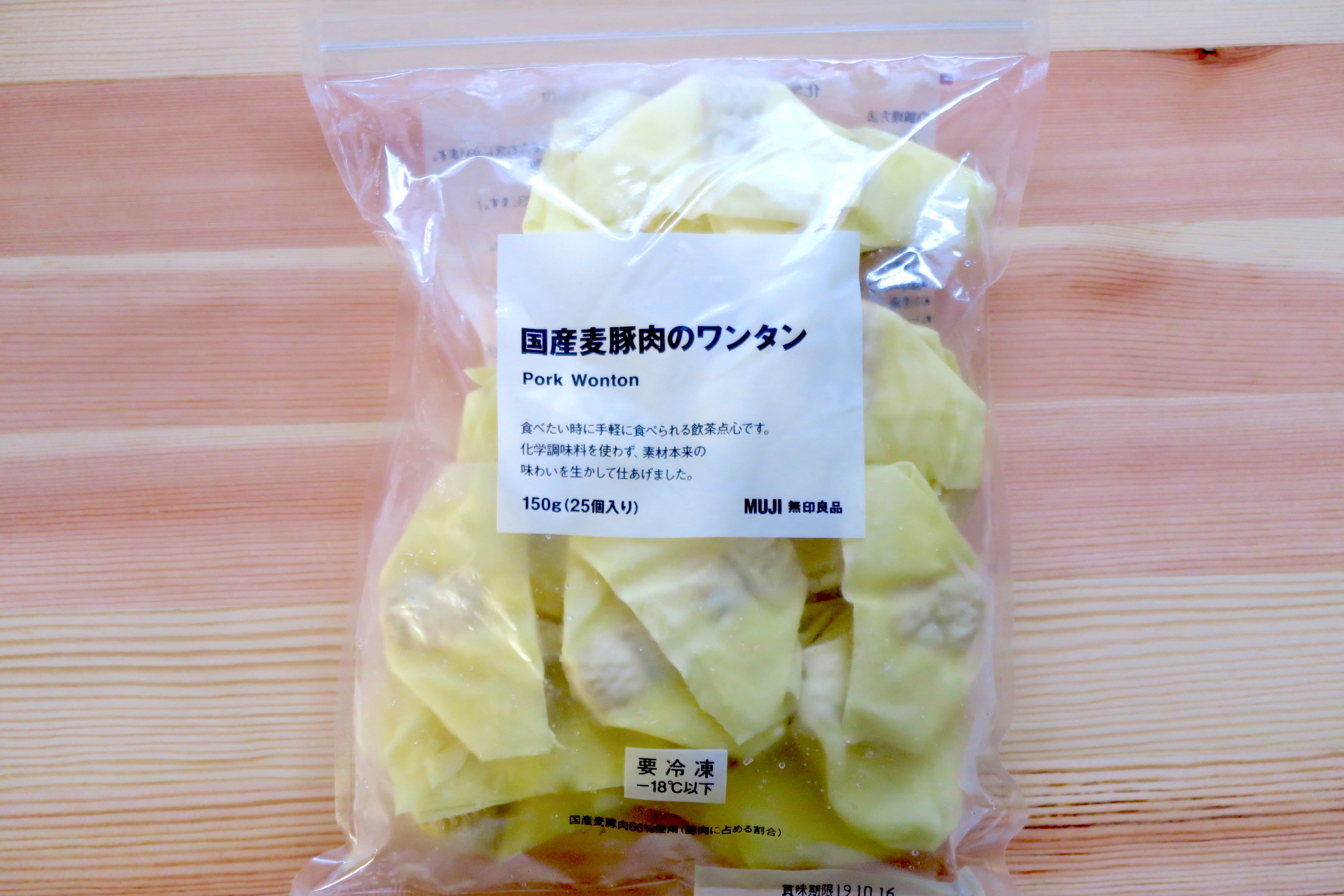 無印良品の冷凍食品には飲茶点心も揃っています。人数に合わせて食べたいぶんだけ調理できるのがいいところ。なかでもおすすめしたいのが「国産麦豚肉のワンタン」です。
