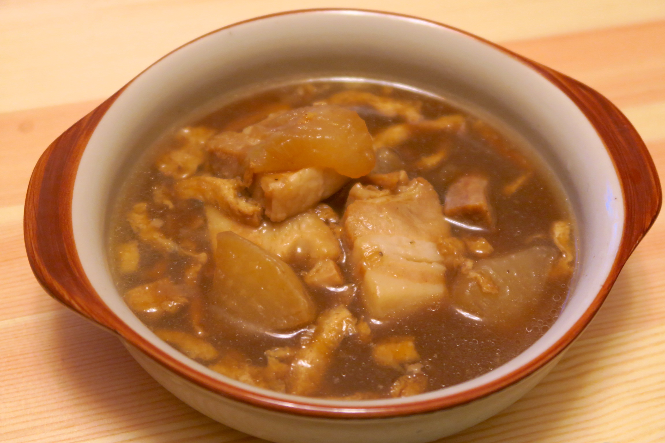 冷凍食品なのでそれっぽい味になっている程度かなと思ったら大間違い。しっかり八角が効いており、まさに異国情緒溢れる味付けなんです。豚肉もほろほろに煮込まれていますし、スープが染み込んだ大根もいい感じ。これはアジアの軽いビールが合いそう。また、面倒な日の夕食はこれとごはんがあれば充分かもしれません。