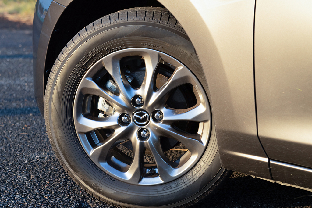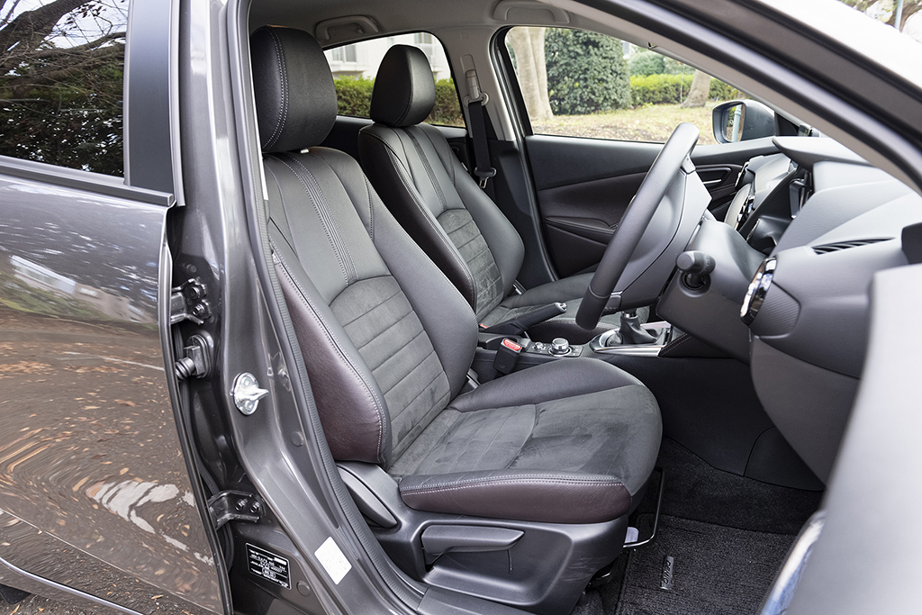 最初にテストドライブへ出掛けたのは、上位グレード「15Sツーリング Lパッケージ」の6速MT車。インテリアには、レザー×グランリュクス(スエード調人工皮革)をあしらったシートが備わるほか、一般的な快適装備がほぼ網羅されています。さらに、マツダ・レーダー・クルーズ・コントロールやアダプティブLEDヘッドライトなどのオプションも試乗車には装着されており、設えに不満を感じることはありませんでした。また、同グレードにはガソリン仕様で唯一、16インチのアルミホイールが標準装備となっています。