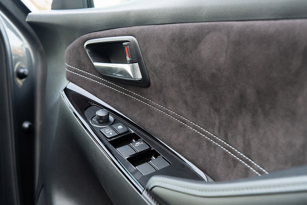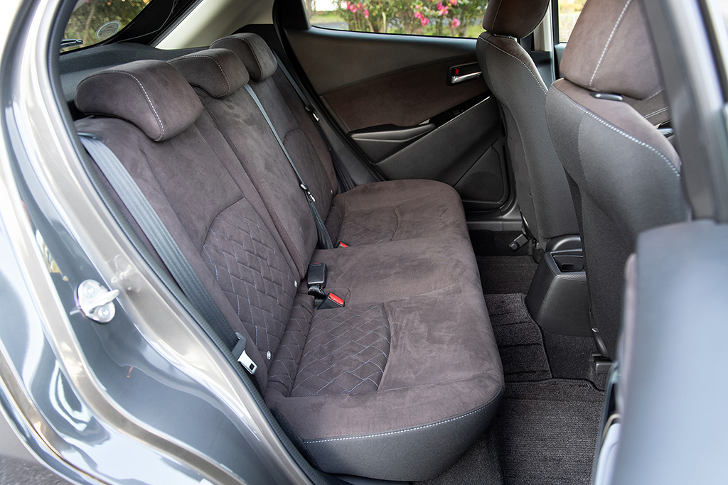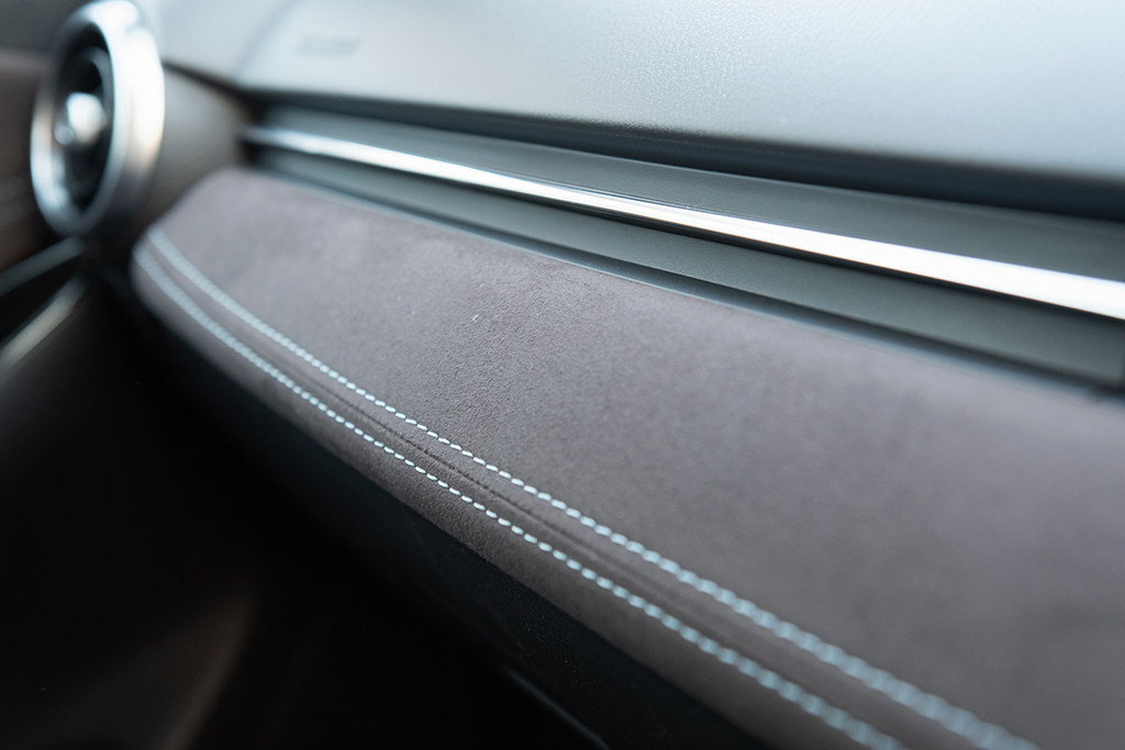 ミストマルーンは、シート表皮に肌触りの良い“グランリュクス”を採用したほか、シートのセンター部分にはブルーのステッチによるキルティング、サイド部にはグレーのステッチを施すなど、エレガントな装いとなっています。また、ドアトリムやインパネも同様のコーディネートとなっており、いわば“小さな高級車”といった仕立て。もちろん、本物と比べてうんぬん、というのは的外れで乱暴ですが、色使いやステッチといった、ちょっとしたあしらいにより、コンパクトカーでもこれほどツヤっぽさを演出できますよ、という、マツダらしい遊び心が感じられます。