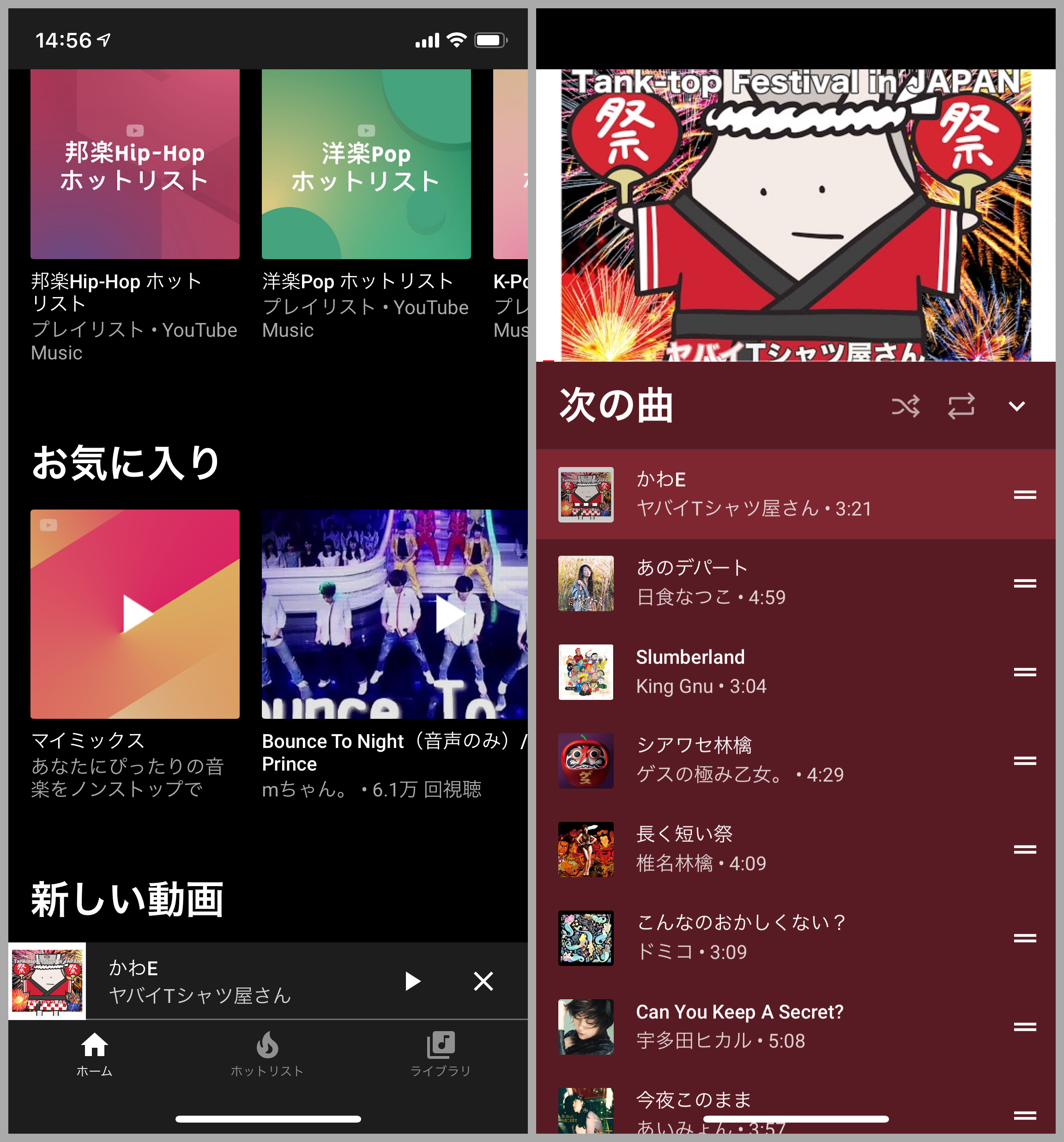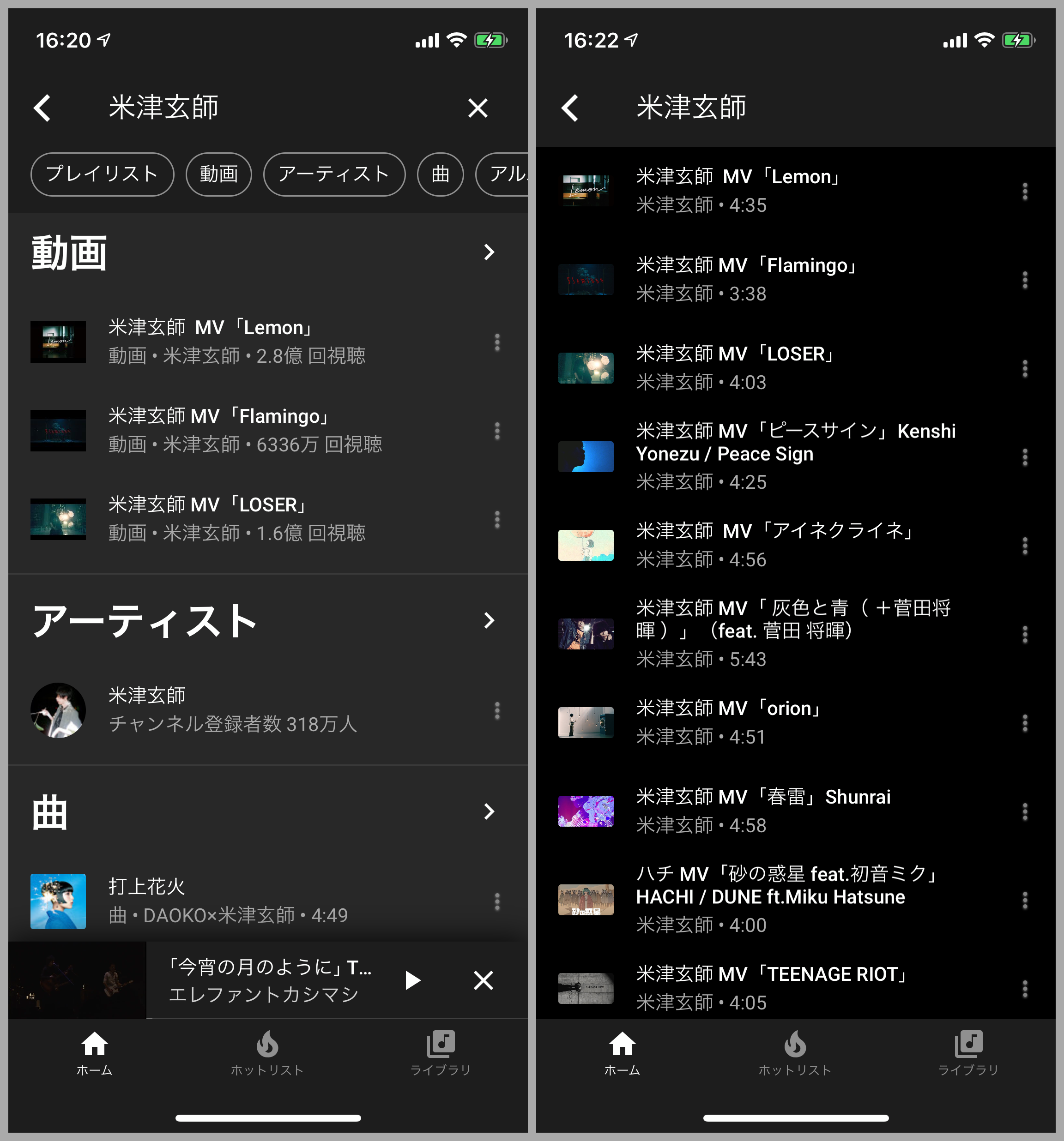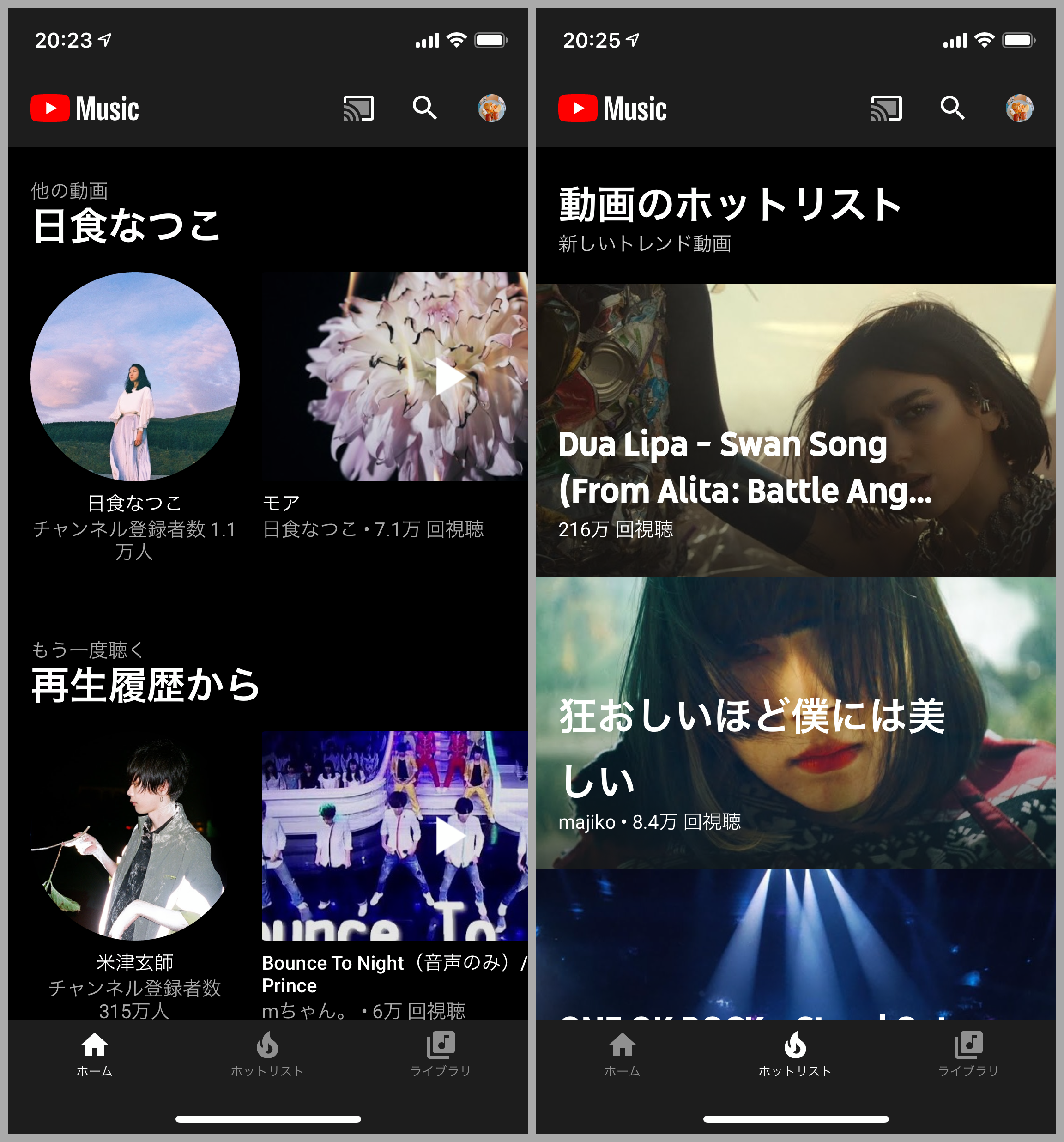 ▲「ホーム」画面には再生履歴に基づくおすすめなどが表示される(写真左)。「ホットリスト」では話題のミュージックビデオがチェックできる(写真右)