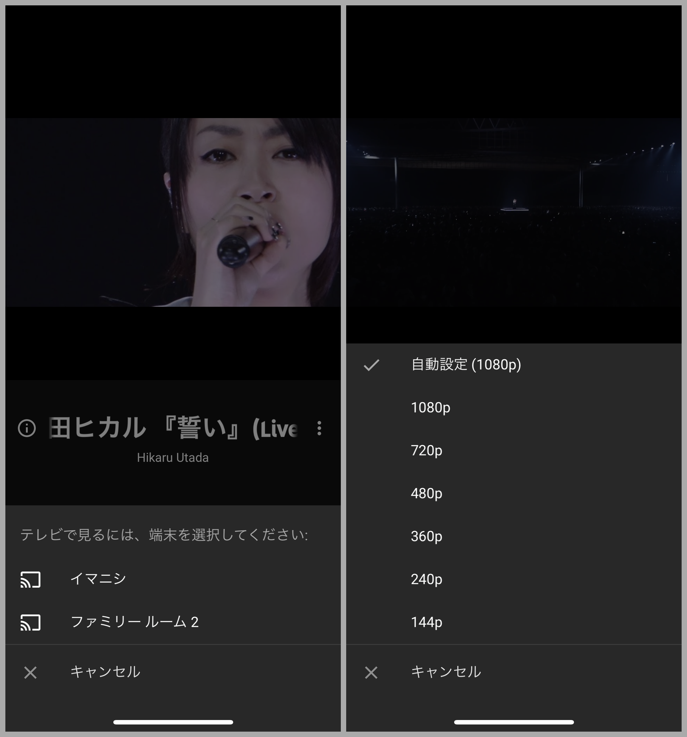 ▲CastボタンをタップしてCast先を選択する(写真=左)。音質は1080〜144pを選択可能(写真=右)