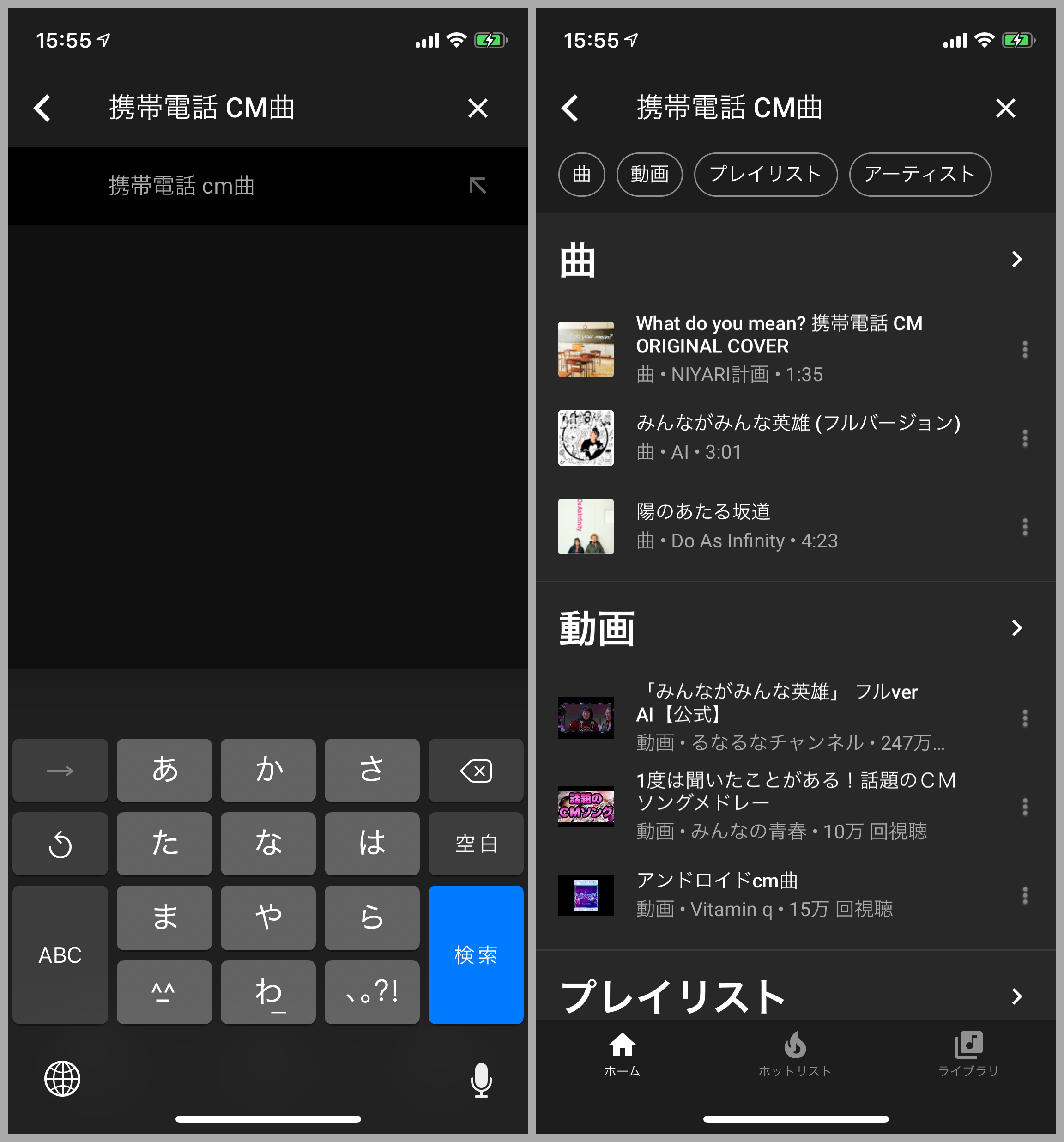 YouTube Musicは検索機能が強化されており、楽曲名やアーティスト名がわからなくても、キーワードや歌詞の一部を入力して検索可能。これはさすがGoogleサービスだなという印象です。これまではGoogleで検索していましたが、最近はYouTube Musicで検索することが増えました。