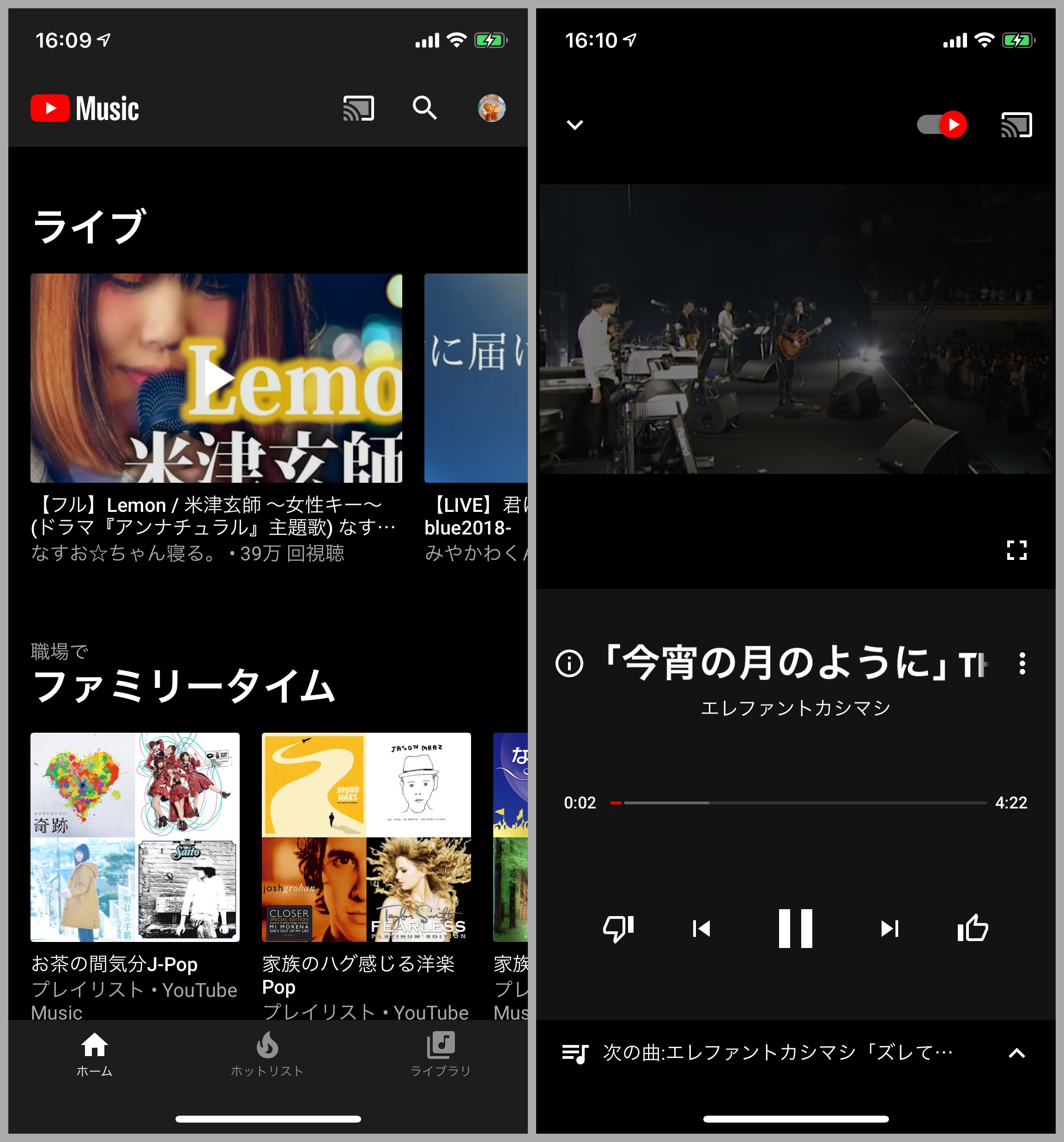 YouTube MusicはYouTube上の動画を抽出しているので、ライブ音源も豊富です。検索結果として出てくるのはもちろん、ホーム画面を観ていると「ライブ」というカテゴリも用意されています。ライブ音源というのは、アーティストのファンやどんなライブかが気になった人に向けたコアなコンテンツだとは思うのですが、これもほかのサービスにはない強み。