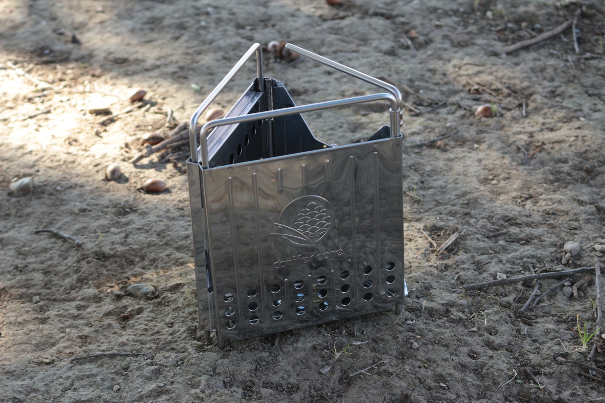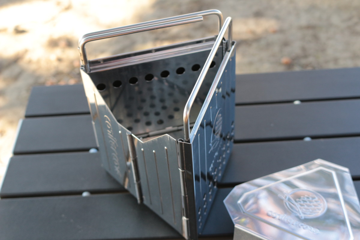 底面は1.2mmのステンレス板で、空気穴があいています。初期モデルは底面が網だったそう。改良型になったことで木炭の利用が可能となりました。