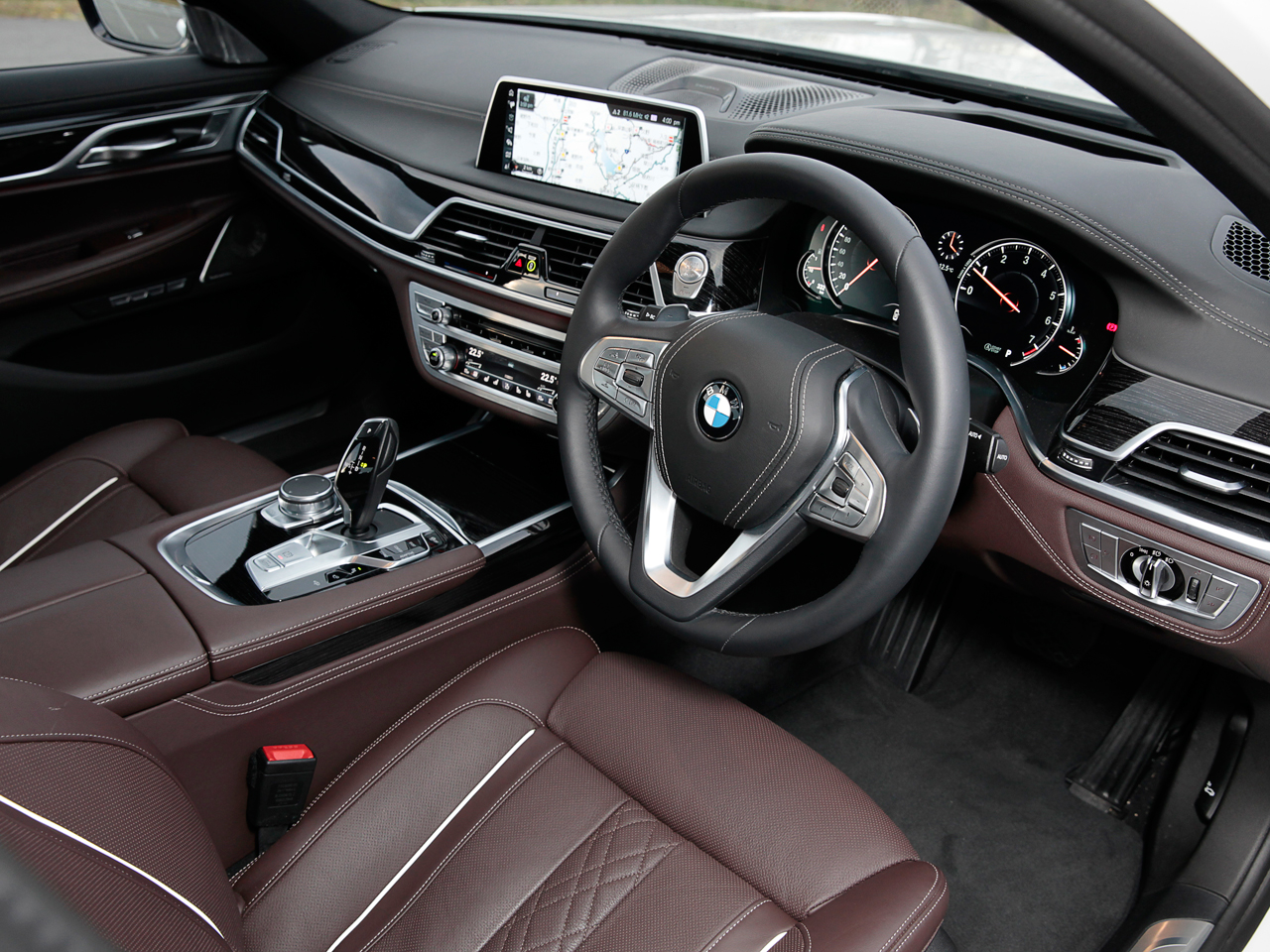 今回試乗できたのは、BWM740i M Sport。前後バンパーがよりスポーティな形状になり、サイドスカートを装着したモデルです。ドアを開けると、サイドシルに「M」の字。インテリアには、豪華で柔らかいエクスクルーシブ・ナッパ・レザーが奢られます。