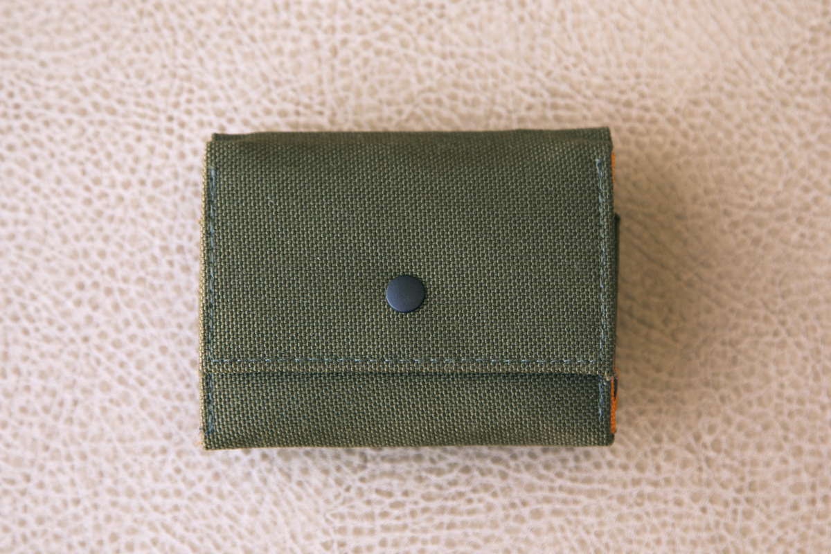 外観はシンプルなデザイン。幅9.5cm、高さ7.5cm、厚さ2.5cm。表側、裏側共にボタンで閉じるようになっていて、表側はお札入れ、裏側は小銭入れになっています。
