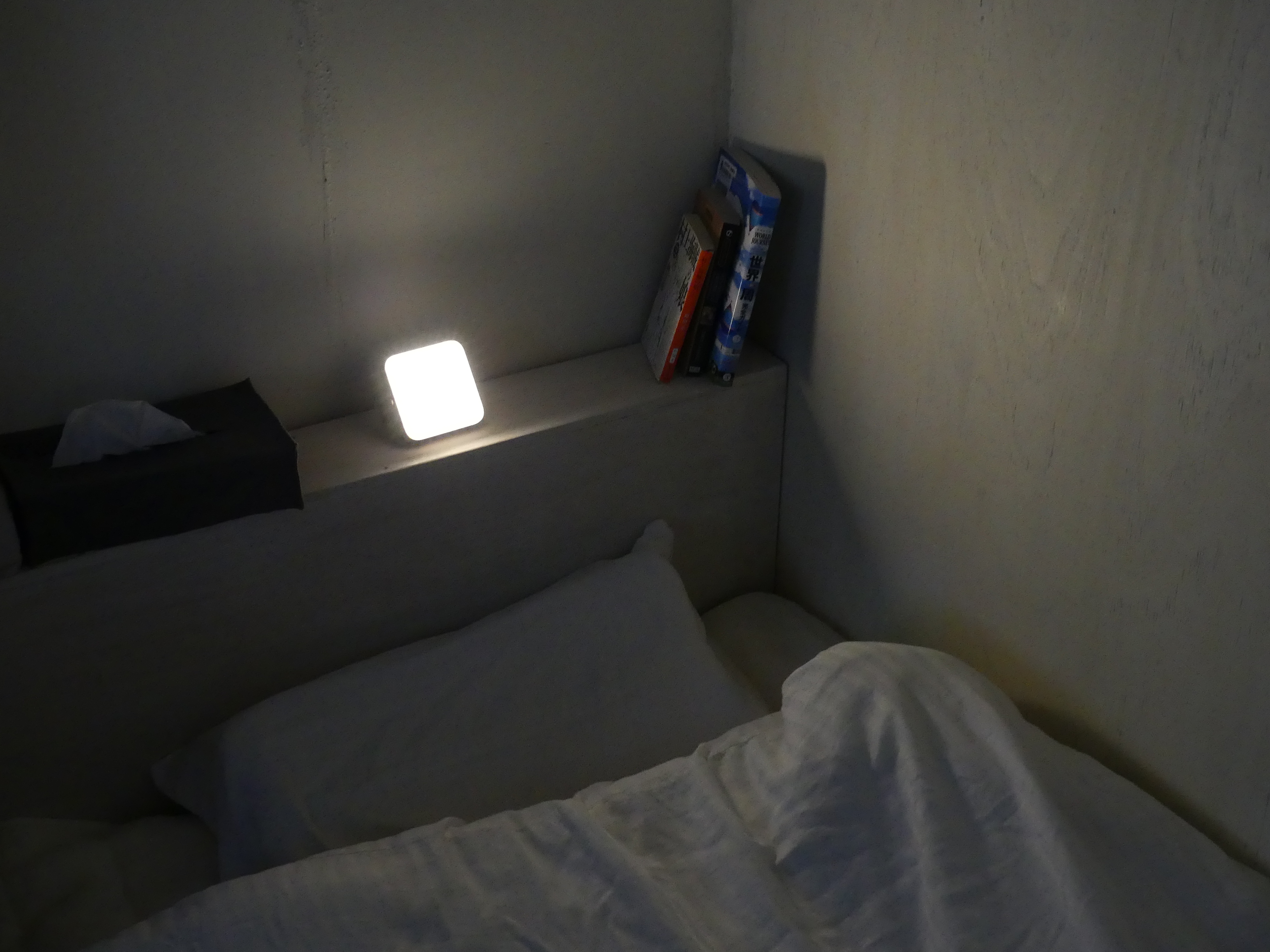 続いて寝室。寝るとき、枕元に立てればブックライトとして活躍してくれます。昼光色にすればやわらかくなるので、読書もはかどる。コードレスなので置き場所は自由だし、もしもの防災時に緊急用のライトとして光源確保の役割もあります。