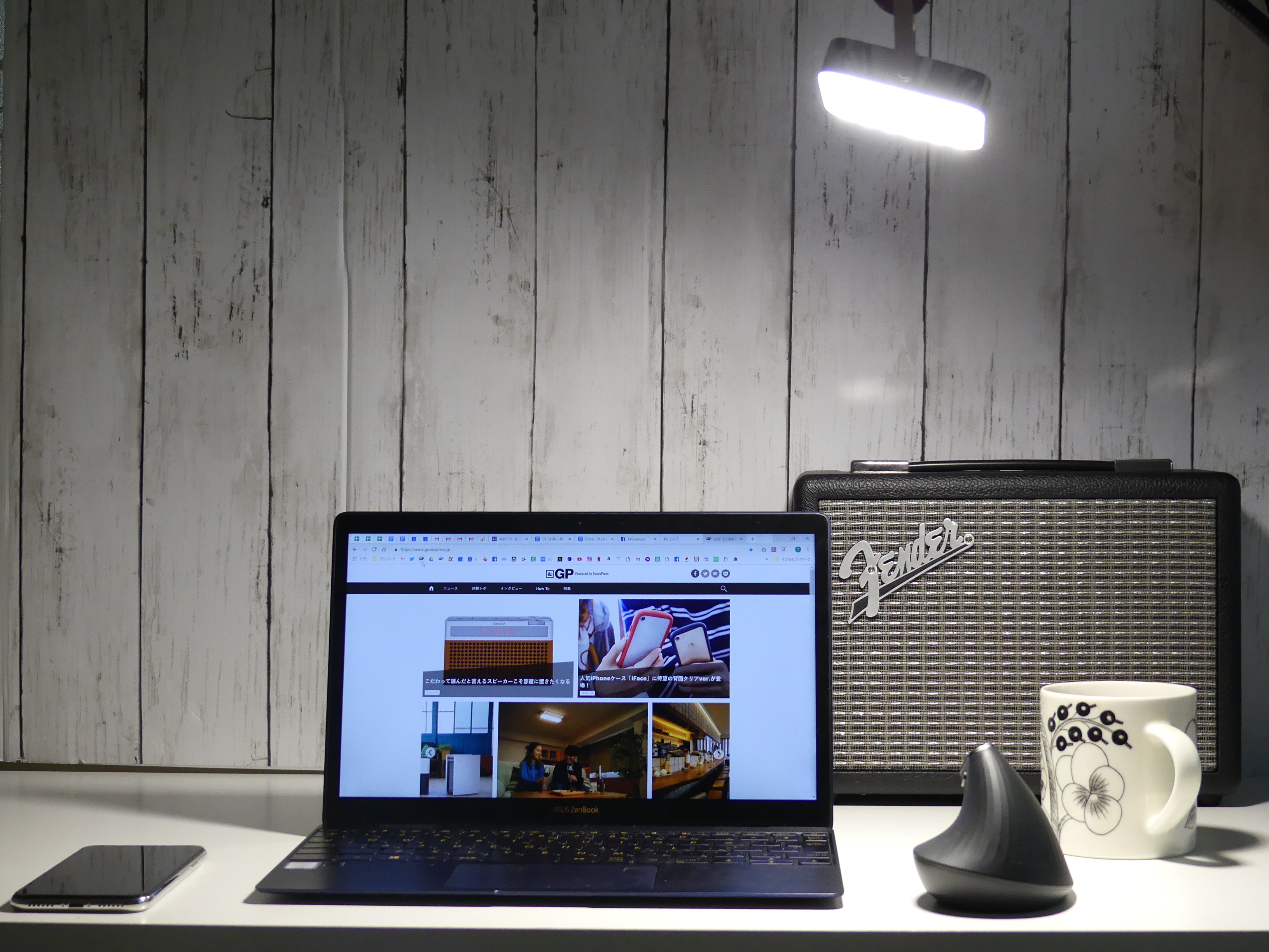 さらに仕事場であるデスク。ここでもぶら下げるだけでデスクライトとして明るさを確保してくれます。意外と使えるのが調色で、「仕事に集中したいとき」は真っ白な昼光色モード、「本を読みながらリラックスしたいとき」は暖かい電球色モードなど、シーンに合わせて切り替えると効率がアップします。
