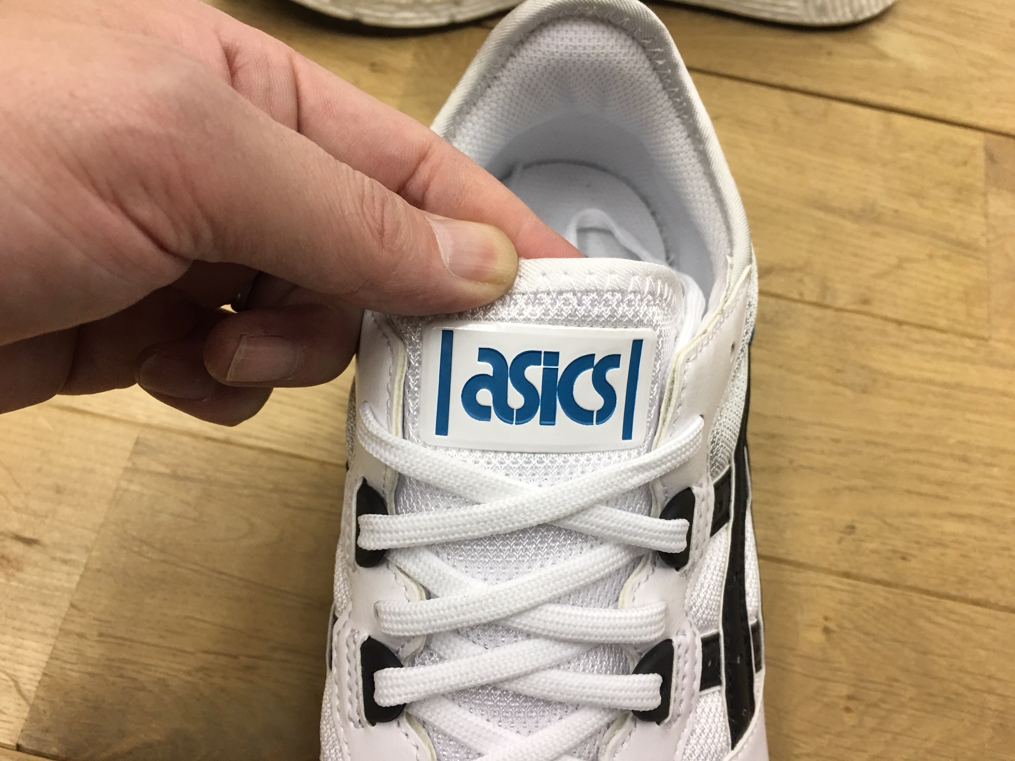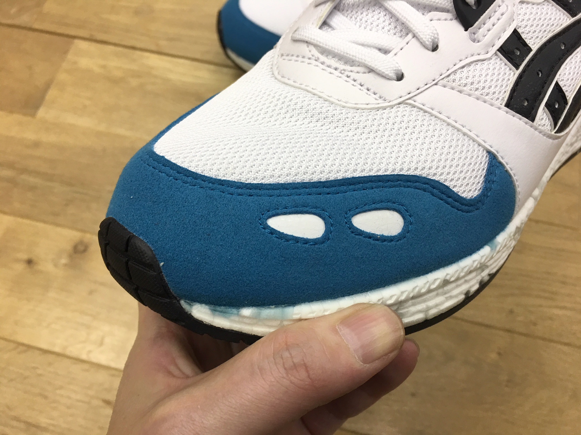 おなじみアシックスストライプはブラック&ホワイトレザーの立体的な二重構造で、存在感を高めています。