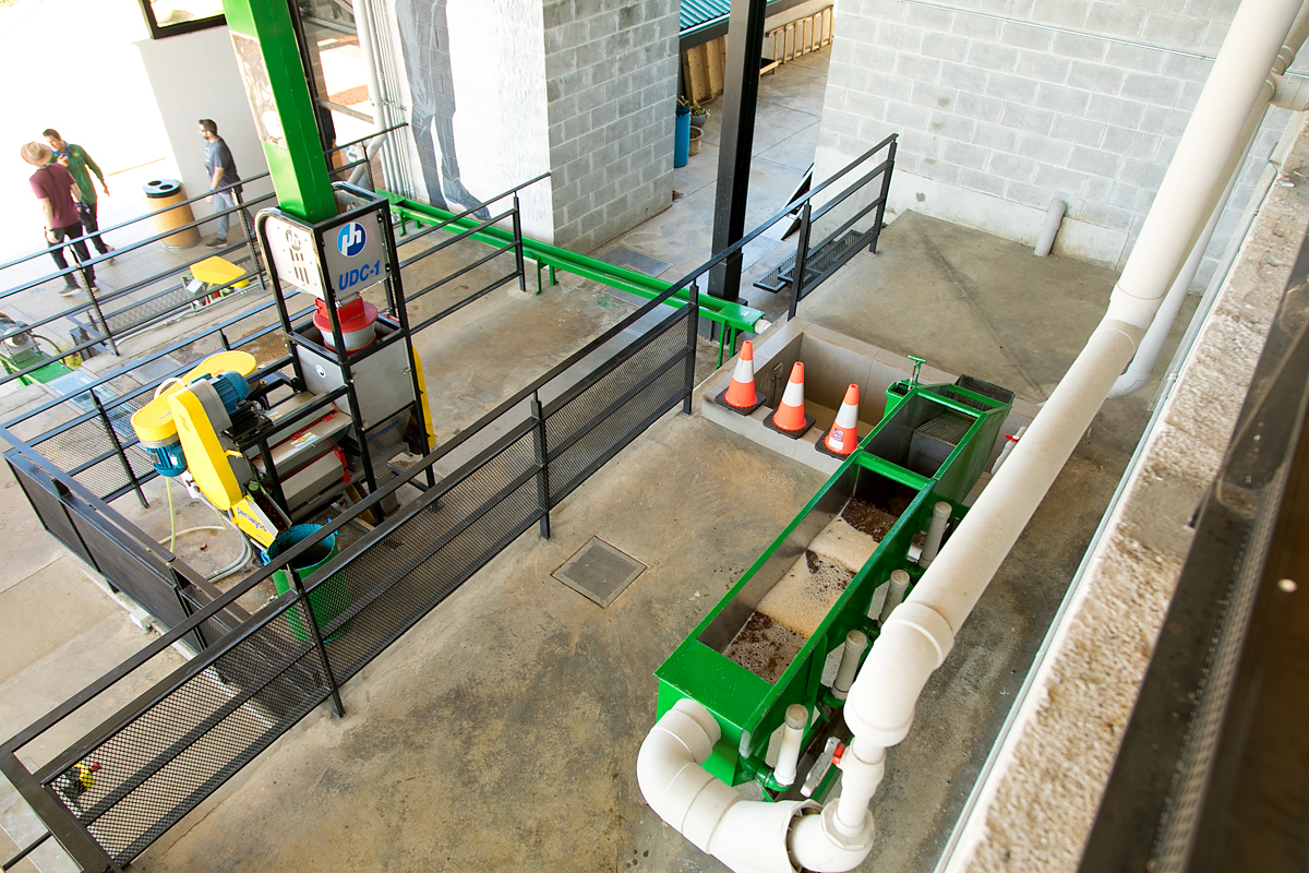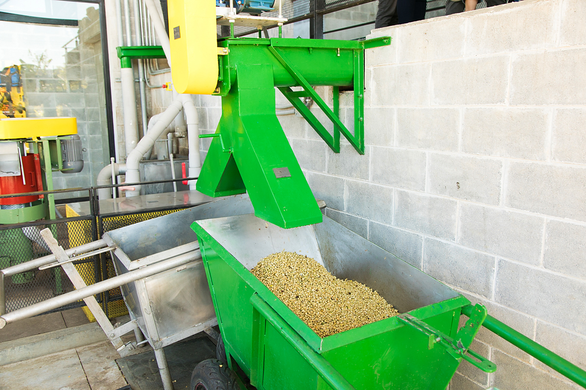 ▲上から下へとコーヒーチェリーが流れていく中で加工されていく