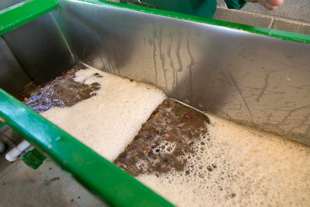 ▲水で洗われるコーヒーチェリー。ここで使われている水はすべて再利用されている