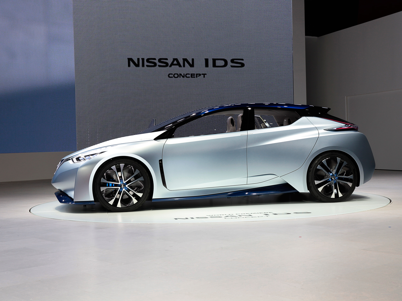 まずはスタイリング。EVの効率を追求していくと、従来のクルマ以上にエアロダイナミクスが重要になります。東京モーターショーのステージ上では分かりにくかったのですが、IDSコンセプトの全高は、わずか1380mm。タイヤ幅は175と細め。もちろんそれらは、空気抵抗を減らすためです。さらに、ホイールはフィンの役目も果たします。ホイール表面に気流の渦を生じさせることで、空気をスムーズに流してやるのだとか。