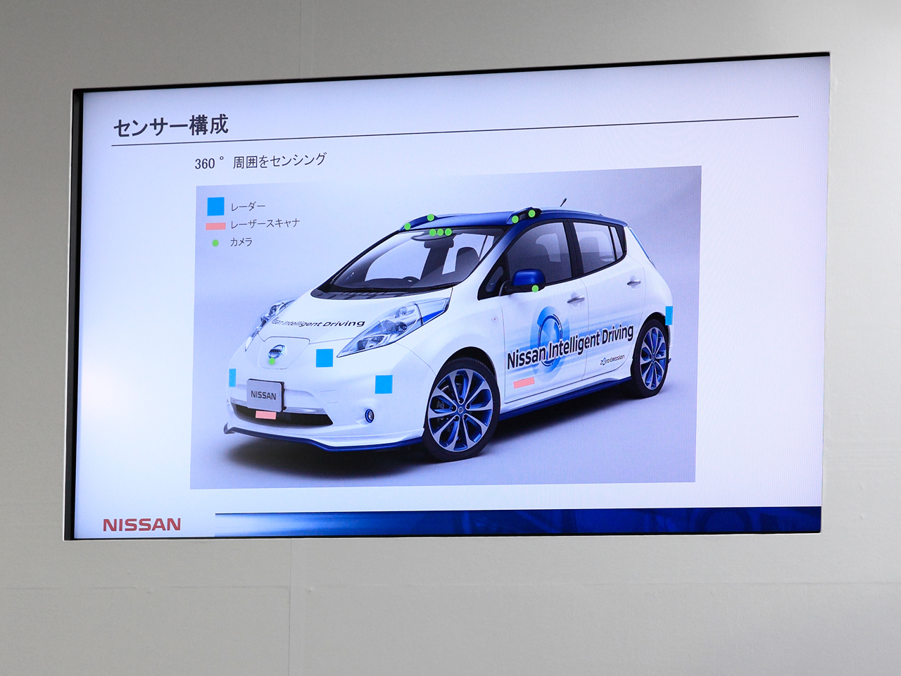 その第一歩が「リーフ」をベースにした実験車両。ボディには、周囲を認識する各種デバイスを複合的に装備しています。比較的遠方をサーチするミリ波レーダー、クルマの進む方向を決める8台のカメラ、そして、3次元計測が可能な高精度レーザーが、周囲の物体を正確に把握します。
