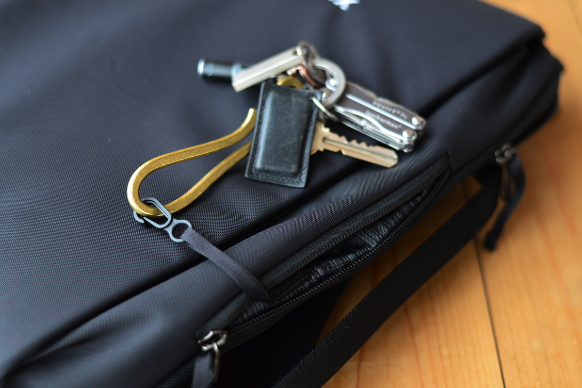 ▲このキークリップストラップの長さがポイント。左肩からショルダーストラップを抜けば、ポケットにキーを付けたまま、玄関の扉を開けられます