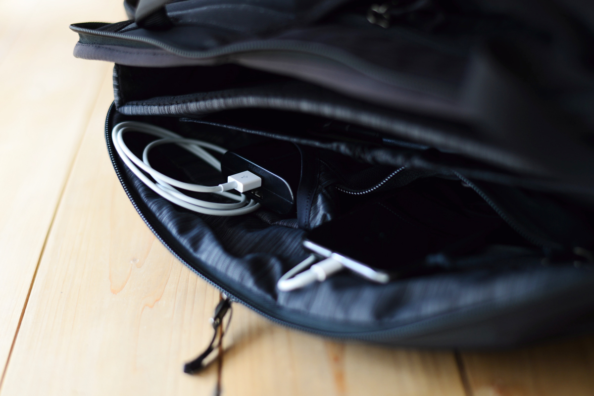 これも意外に便利な、背面のバックパネルにあるスタッシュ(隠し)ポケット。会社に入る際のIDパスを入れておくのに重宝していますが、ポータブルバッテリーを入れておくのにもいいかもしれません。隠しポケットになっているので、旅行の際は、パスポートなどを入れるのに使ってもいいでしょう。