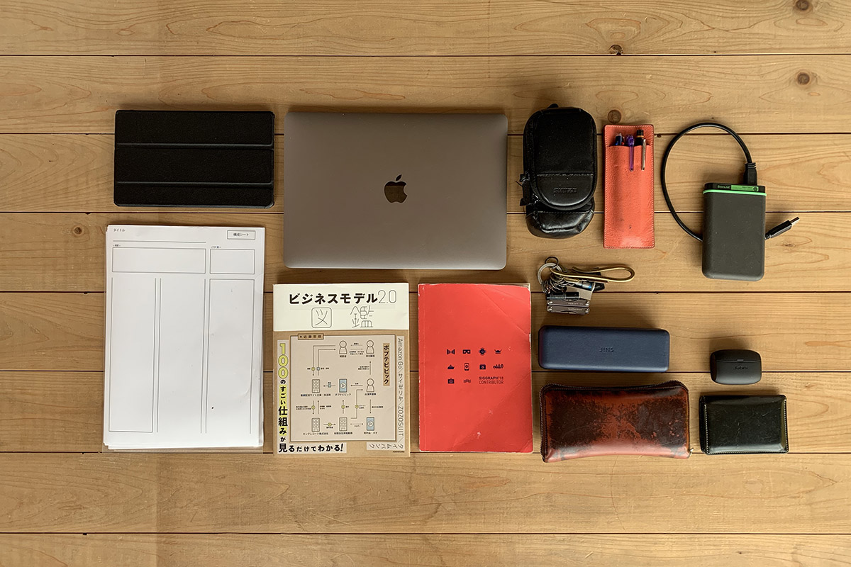 今回思い切って持ち物を見直した結果、カバンに入れるものは、PC、モバイルバッテリー、完全ワイヤレスイヤホン、メガネ、財布、名刺入れ、鍵、IDパス。これまで持ち歩いていた本はスマホで、ハードディスクはクラウドで代用が効くため持ち歩かないことに決めました。