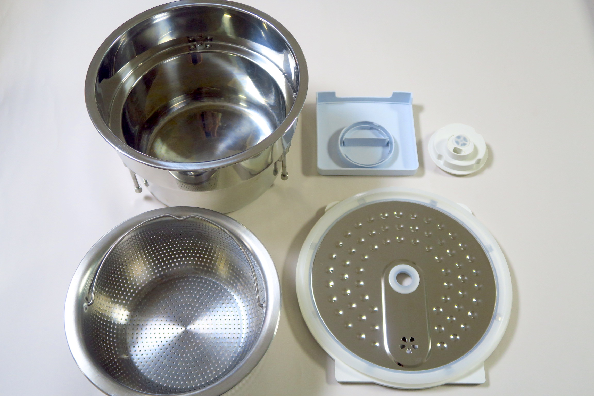 ▲内釜はザルのようになっているので、ていねいにごはん粒を落とすのがやや大変。少しお湯に浸けてから洗うといい