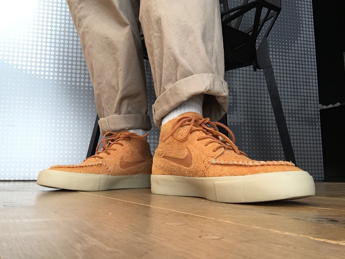 こちらは、ナイキ SBを代表するモデルのひとつで、トップスケーター、ステファン・ジャノスキーの名を冠したシグネチャーシューズの誕生10周年を記念した「ナイキ SB ズーム ジャノスキー MID ウルトラ クラフテッド」です。モカシンをモチーフにしたデザインが特徴で、トウを職人による手縫で仕上げていたり、インソールにコルクを配したりと、シックでナチュラルなテイストを強調した一足となっています。それにしても、スケートボード用には見えませんよね~。