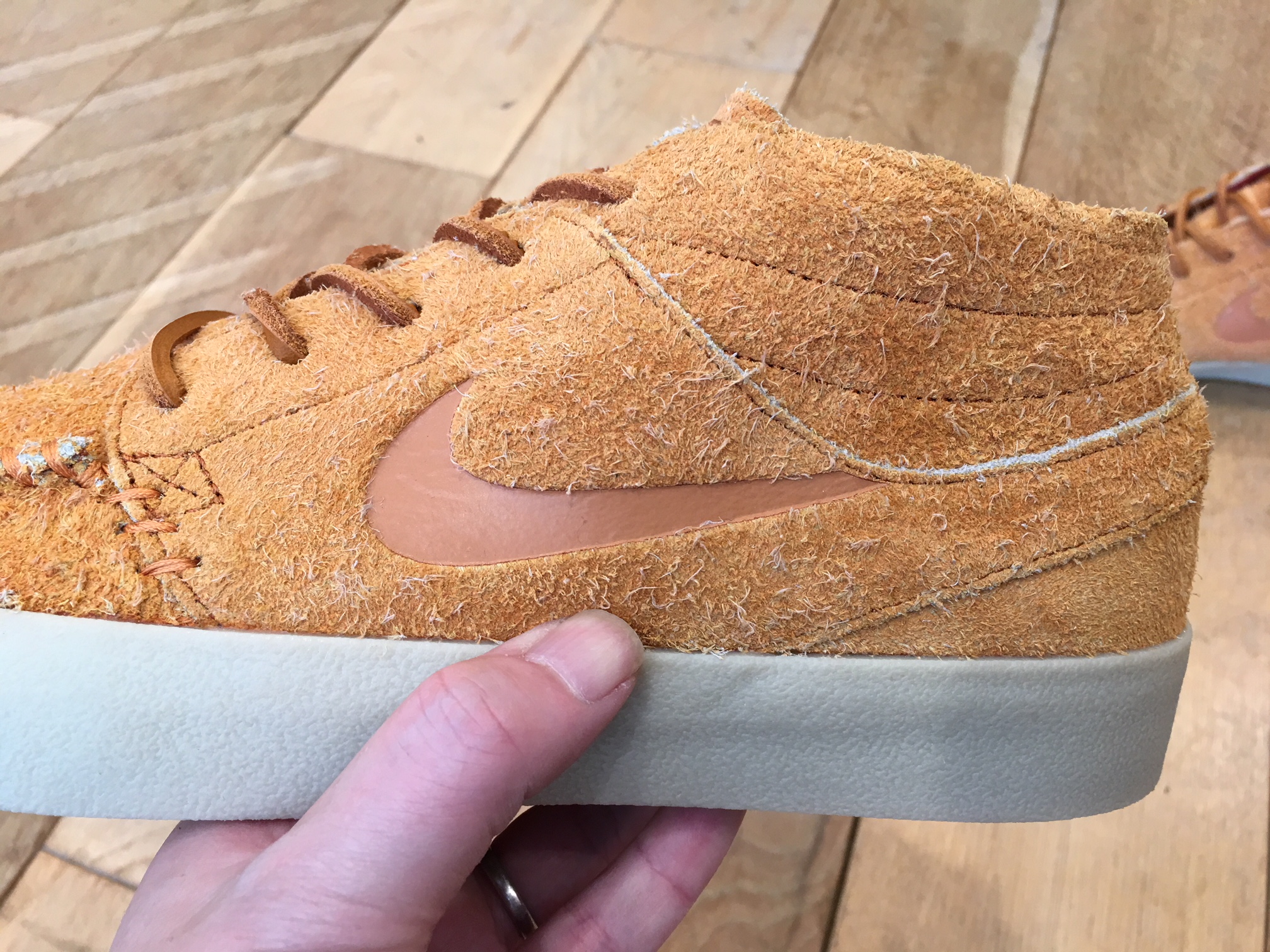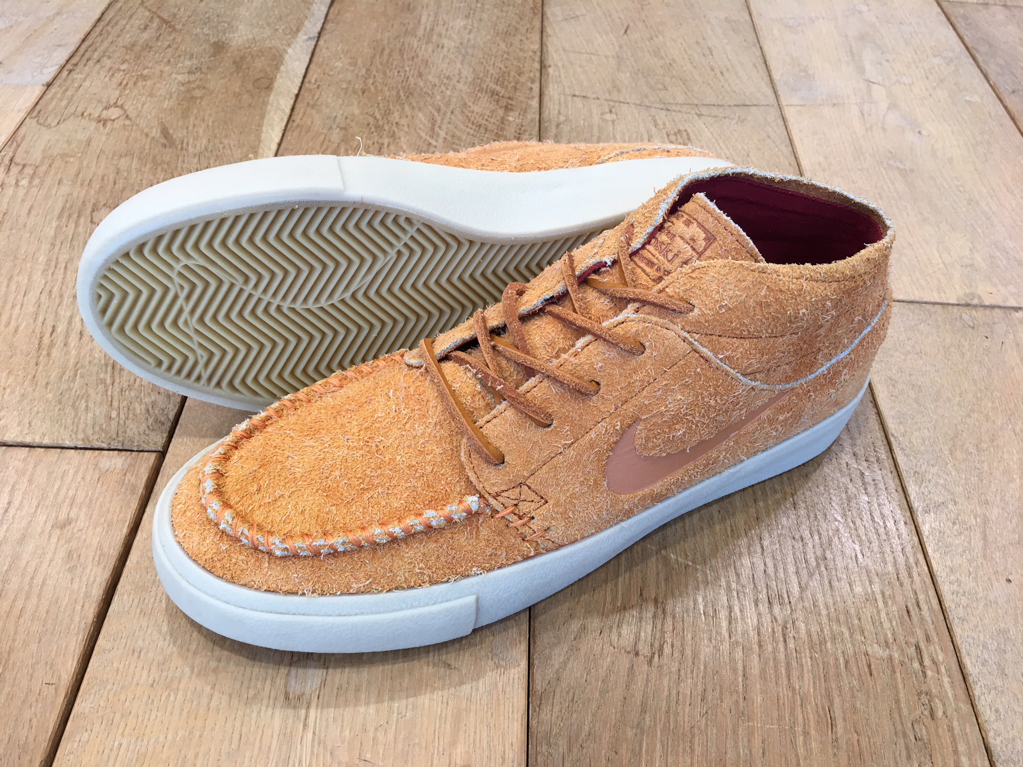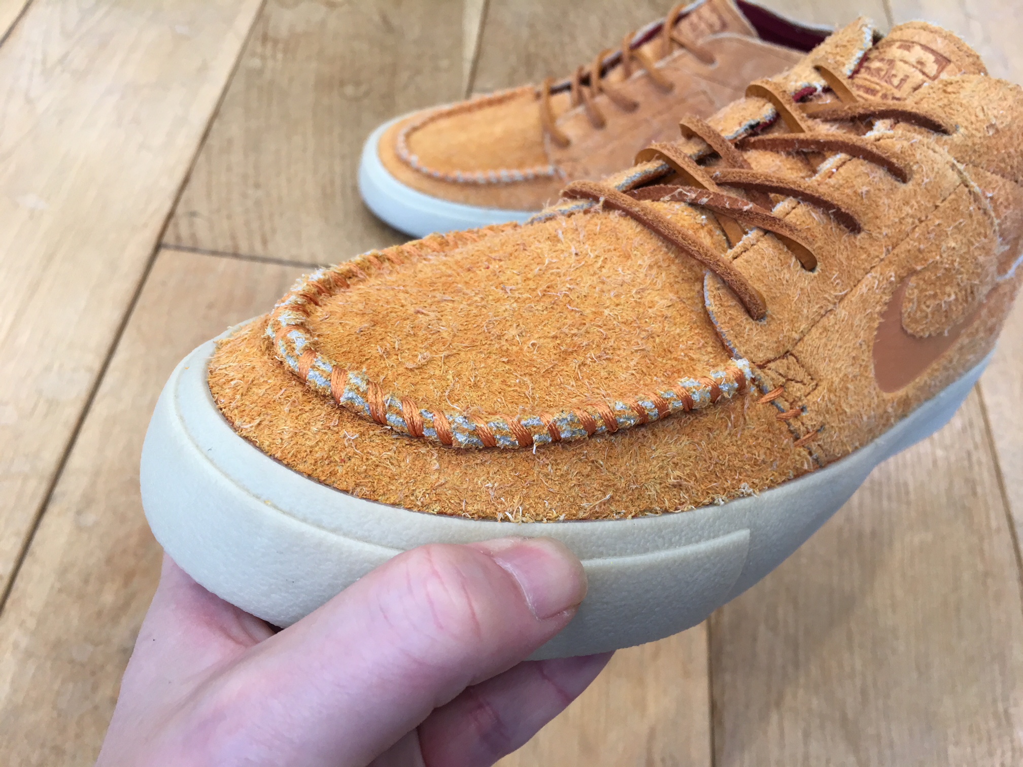 アッパーはテクスチャード加工が施された毛足の長いスエードを使用していて、ふっくらとして柔らかな質感となっています。そしてモカシンをモチーフにしたトウは手縫いで仕上げられています。